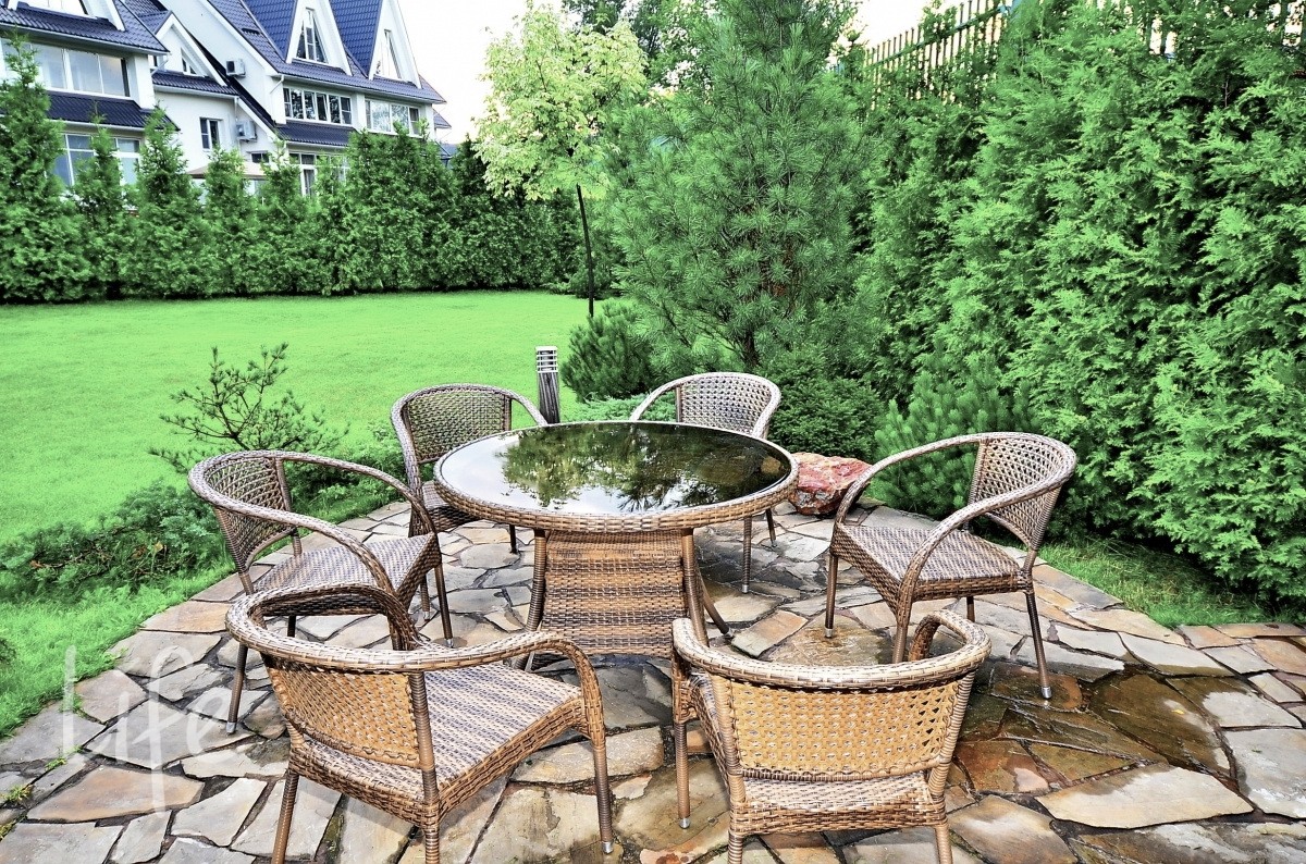 Придомовая территория газон, декоративные деревья и кустарники, ночное освещение.