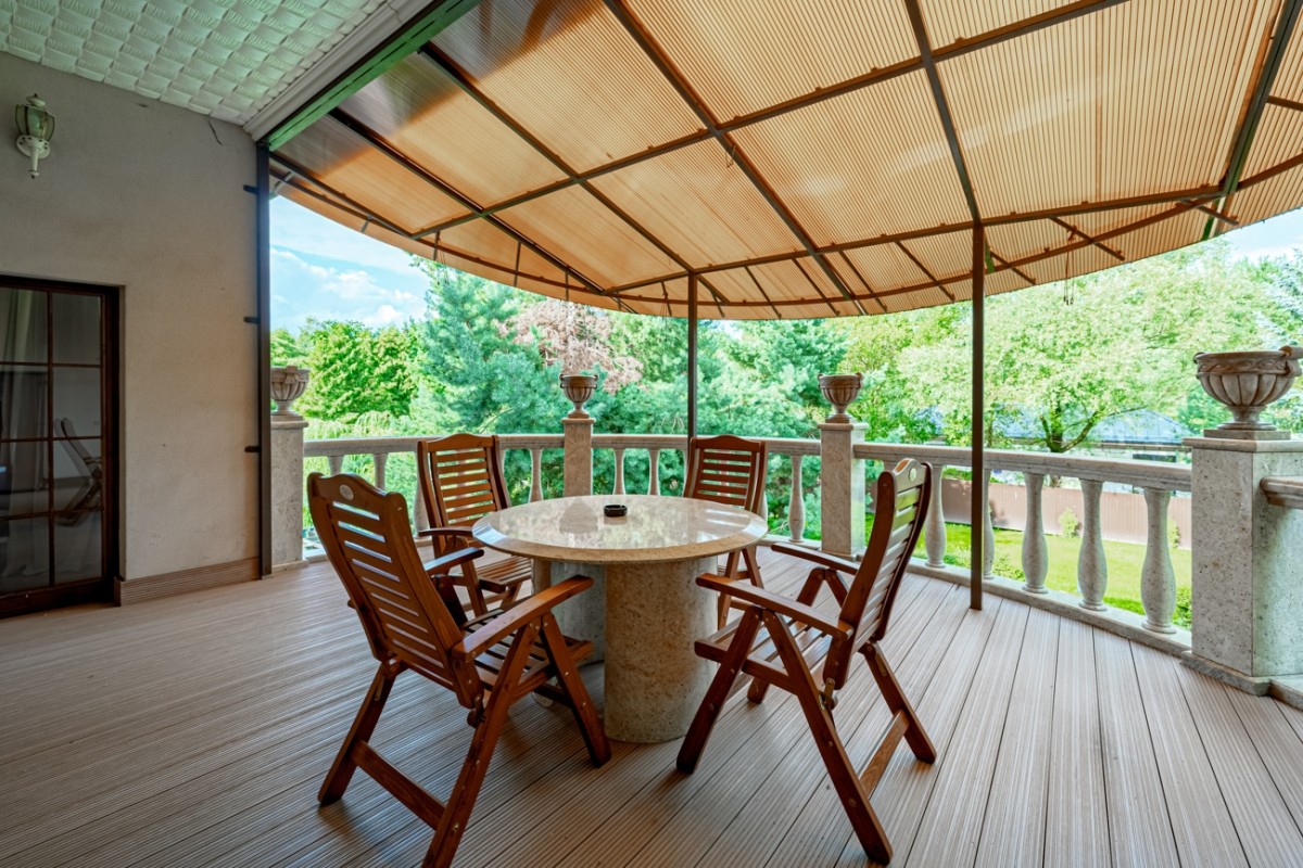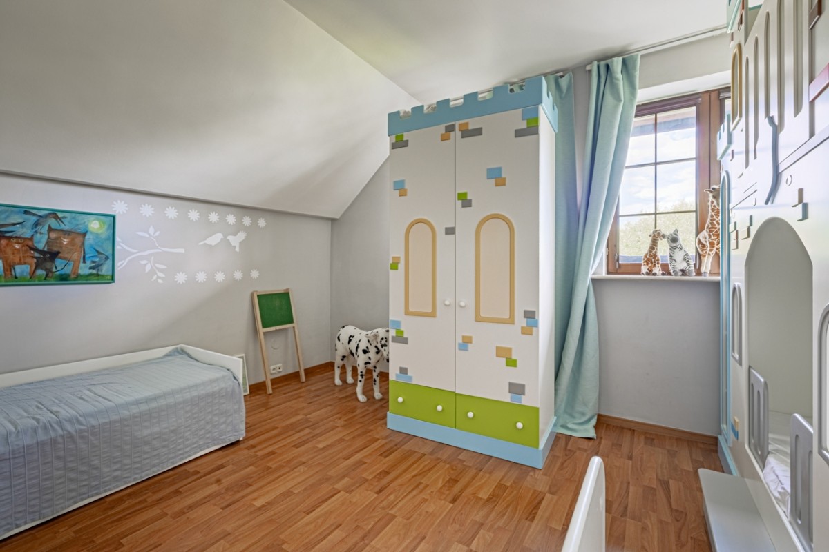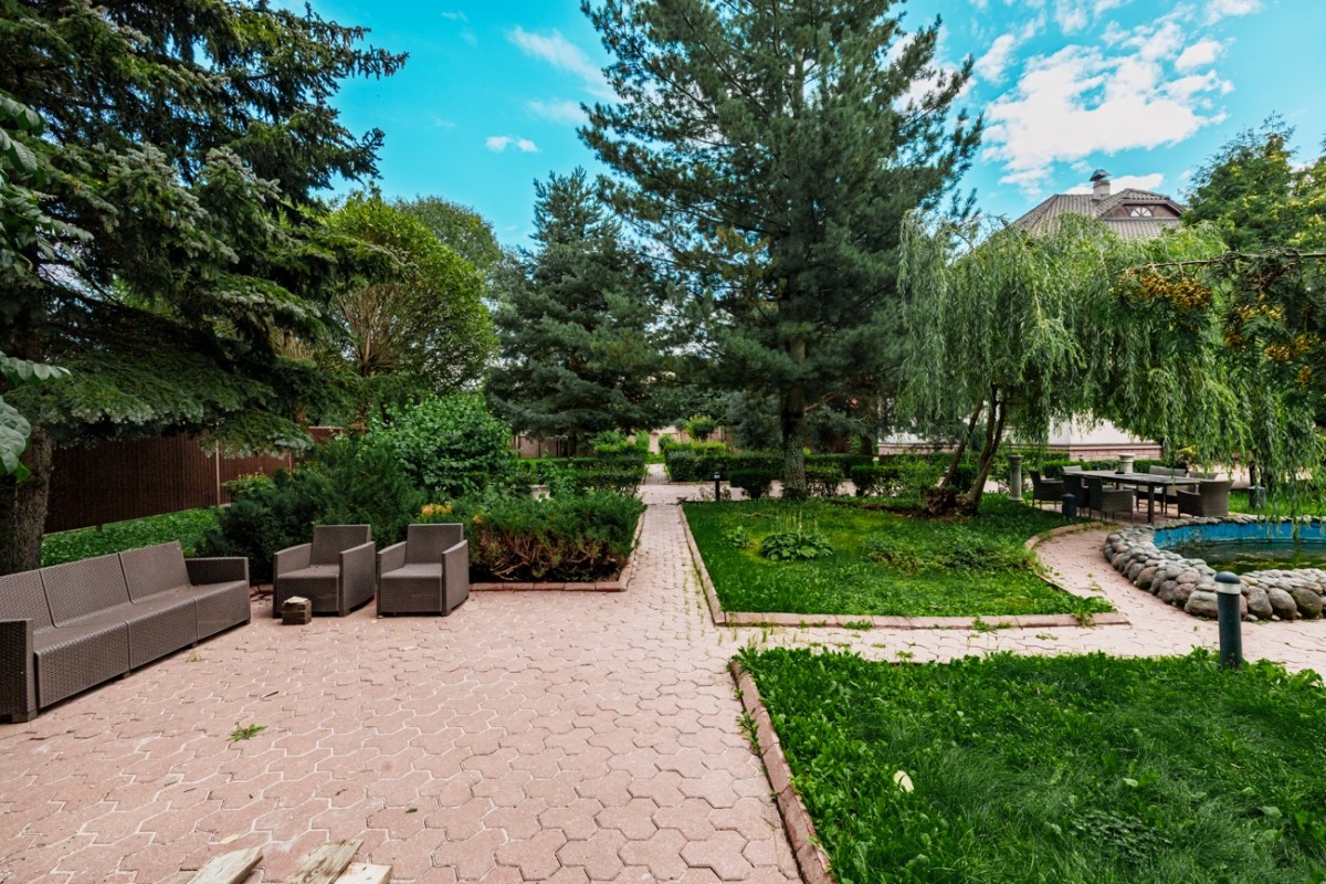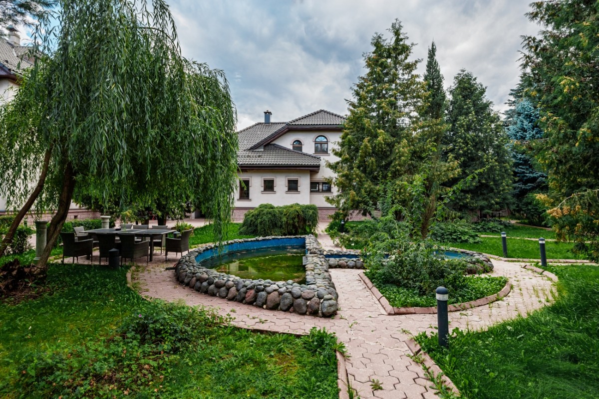 На участке выполнен ландшафтный дизайн, есть небольшой пруд с фонтаном, детская спортивная площадка, беседка с BBQ.