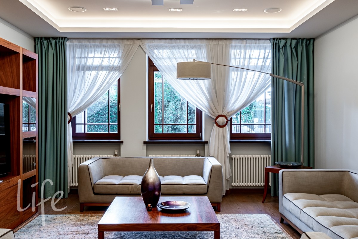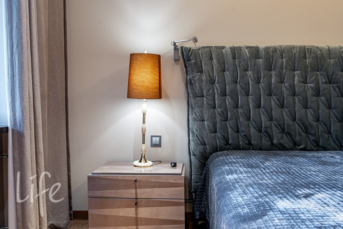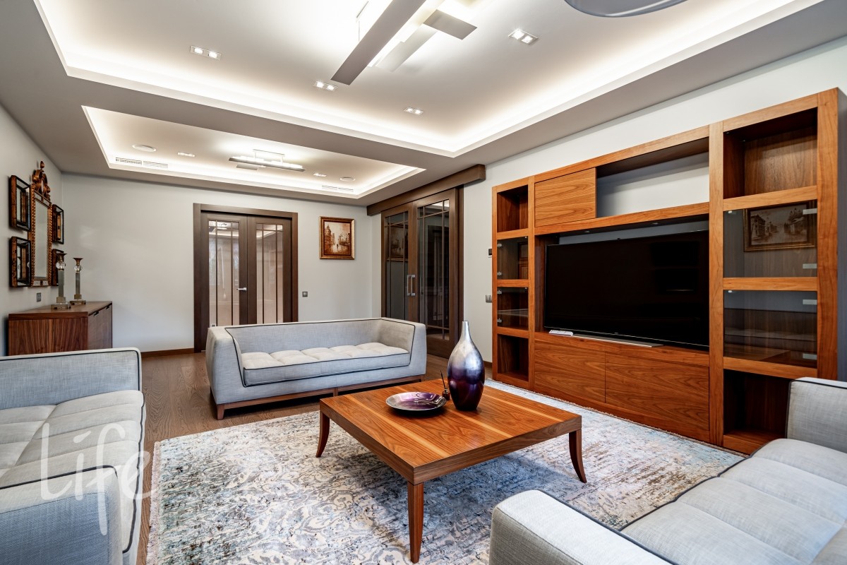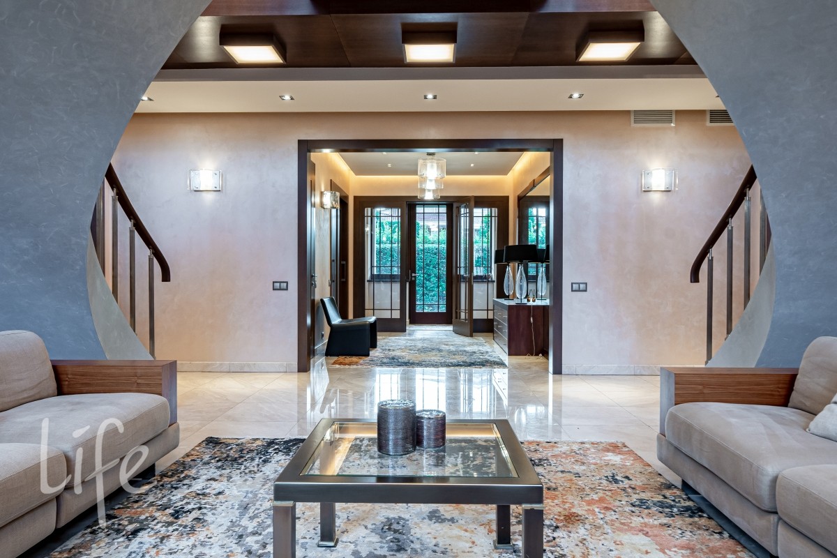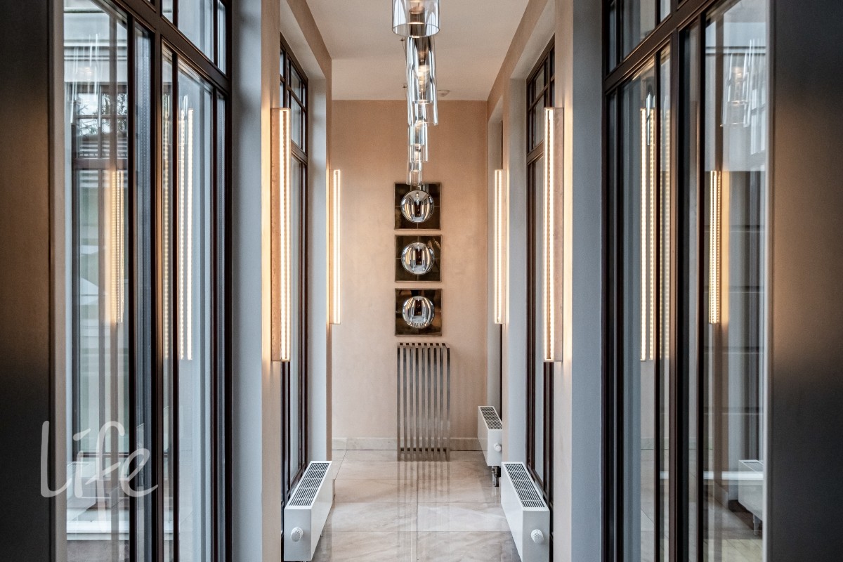 Дизайнерский интерьер выполнен в современном классическом стиле, в мягких светлых тонах, со вкусом подобраны мебель и аксессуары. Эксклюзивная мебель представлена от ведущих мировых производителей. Камин в каминном зале создаёт атмосферу уюта.