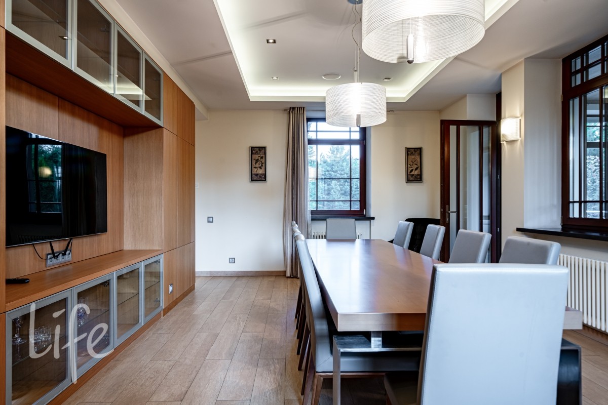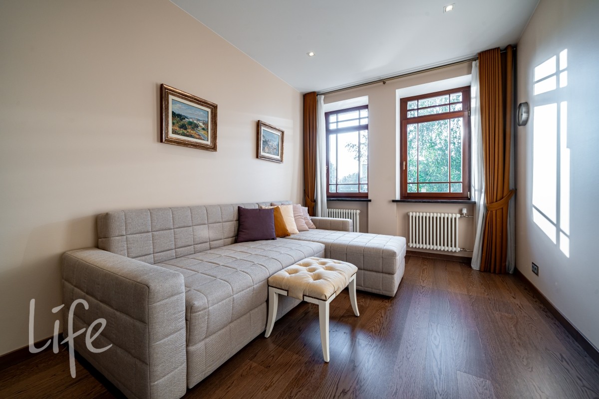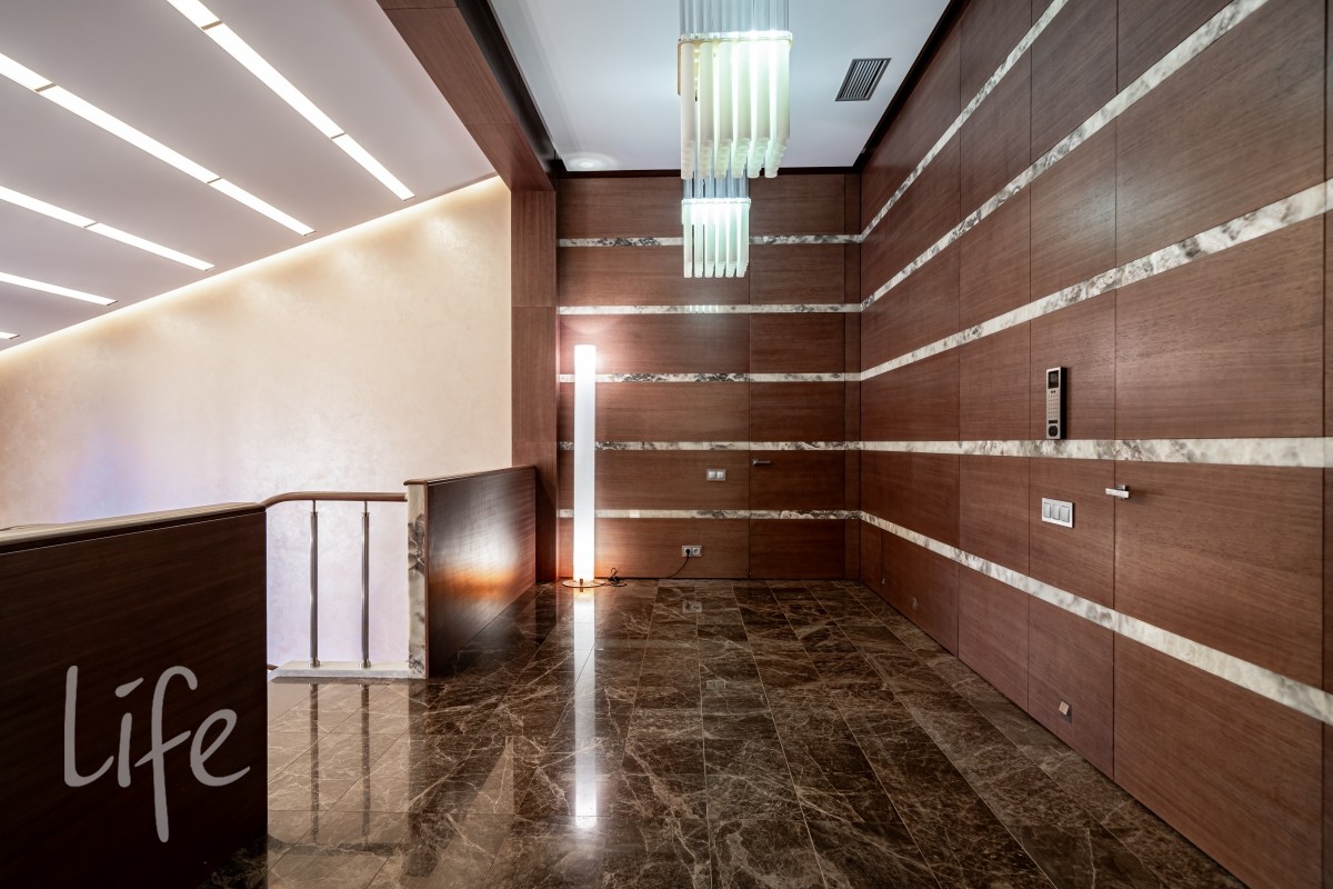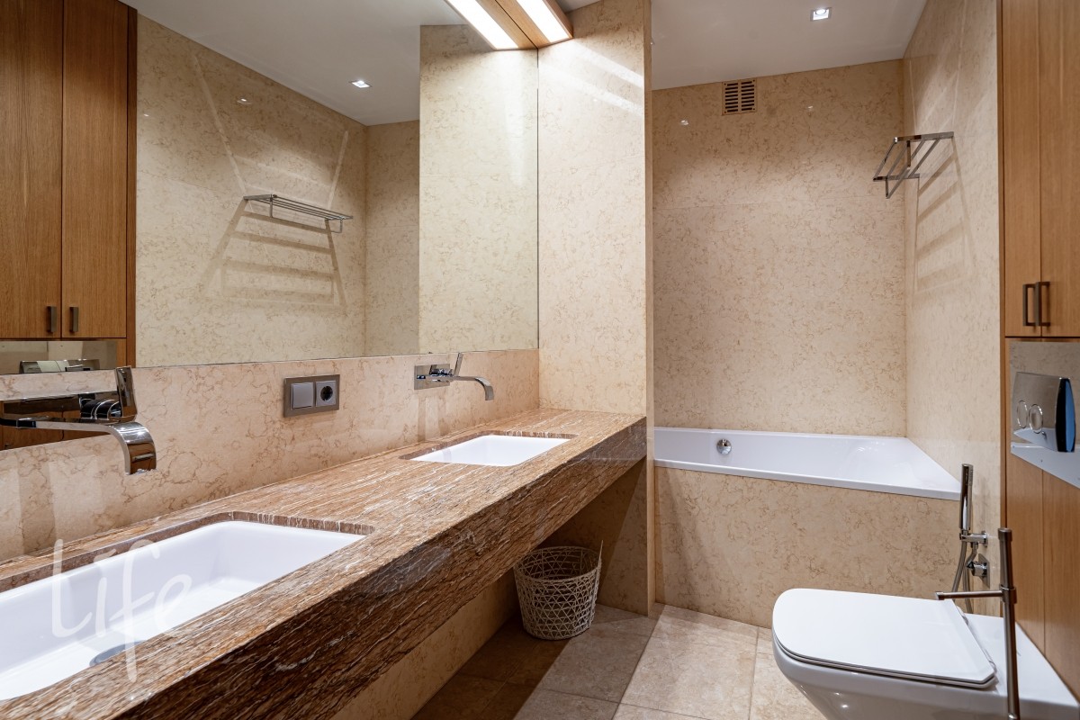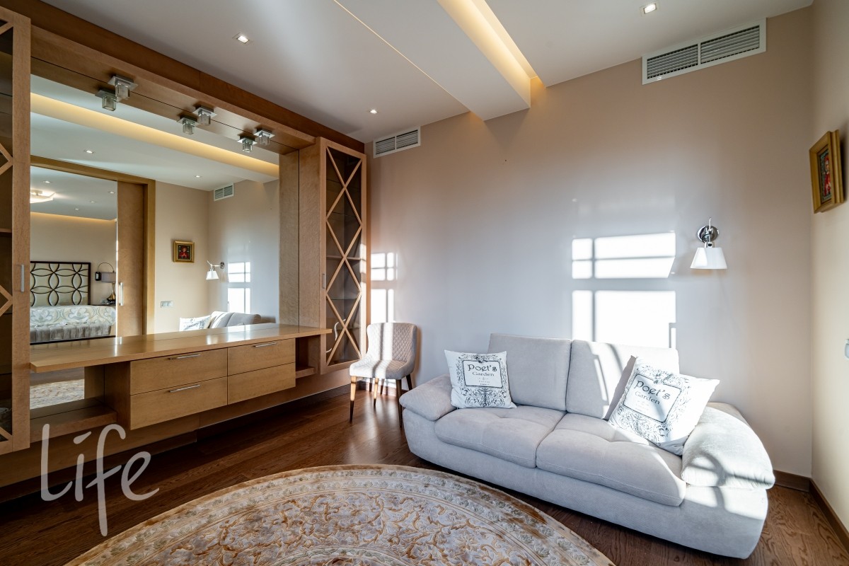 Дизайнерский интерьер выполнен в современном классическом стиле, в мягких светлых тонах, со вкусом подобраны мебель и аксессуары. Эксклюзивная мебель представлена от ведущих мировых производителей. Камин в каминном зале создаёт атмосферу уюта.