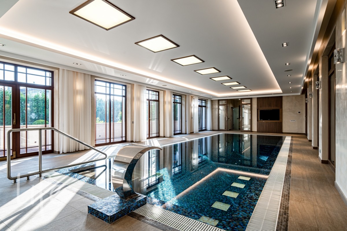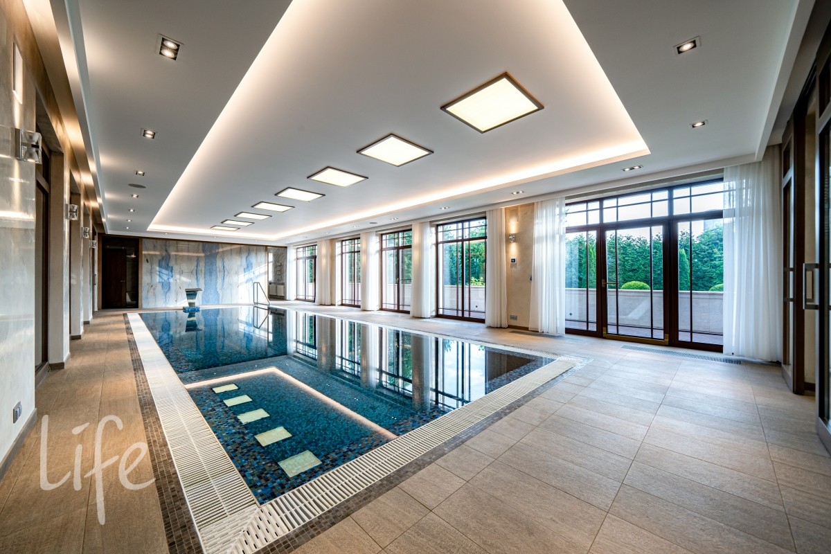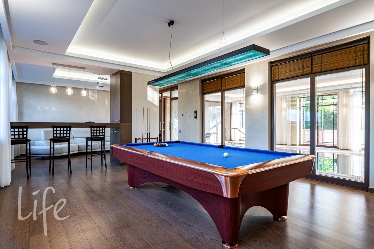 1 этаж: прихожая, гардеробная, каминный зал со вторым светом, гостиная с кабинетом, столовая, кухня, зона отдыха с выходом на террасу, две спальни, два с/у, СПА-зона — 12-метровый бассейн, сауна, зона отдыха, бильярдная, с/у с душевой, раздевалка, гараж на два автомобиля.