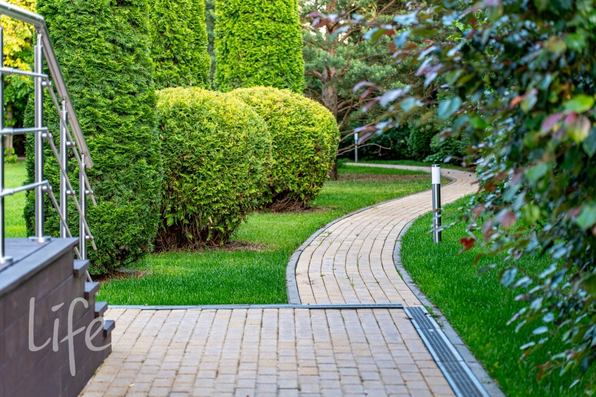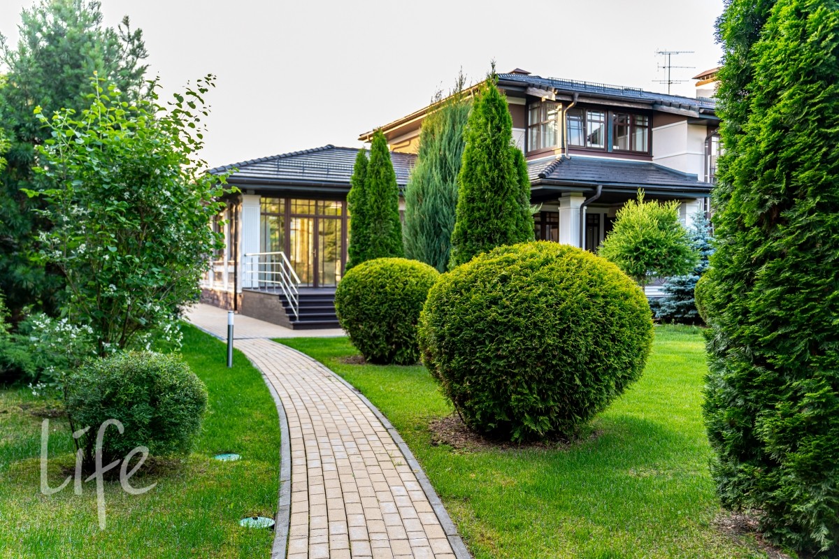 Участок правильной прямоугольной формы с выполненным ландшафтным дизайном. Газон, декоративные деревья и кустарники, ночное освещение, парковка для автомобилей. На территории расположена беседка BBQ.