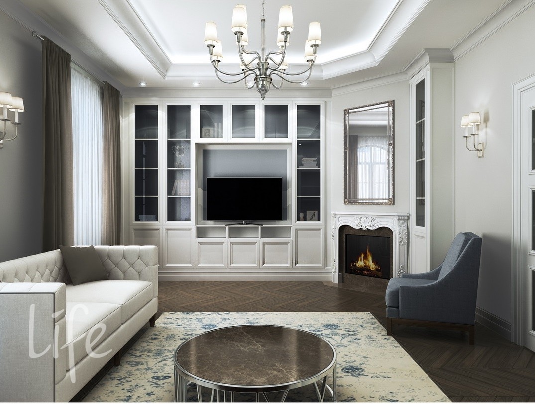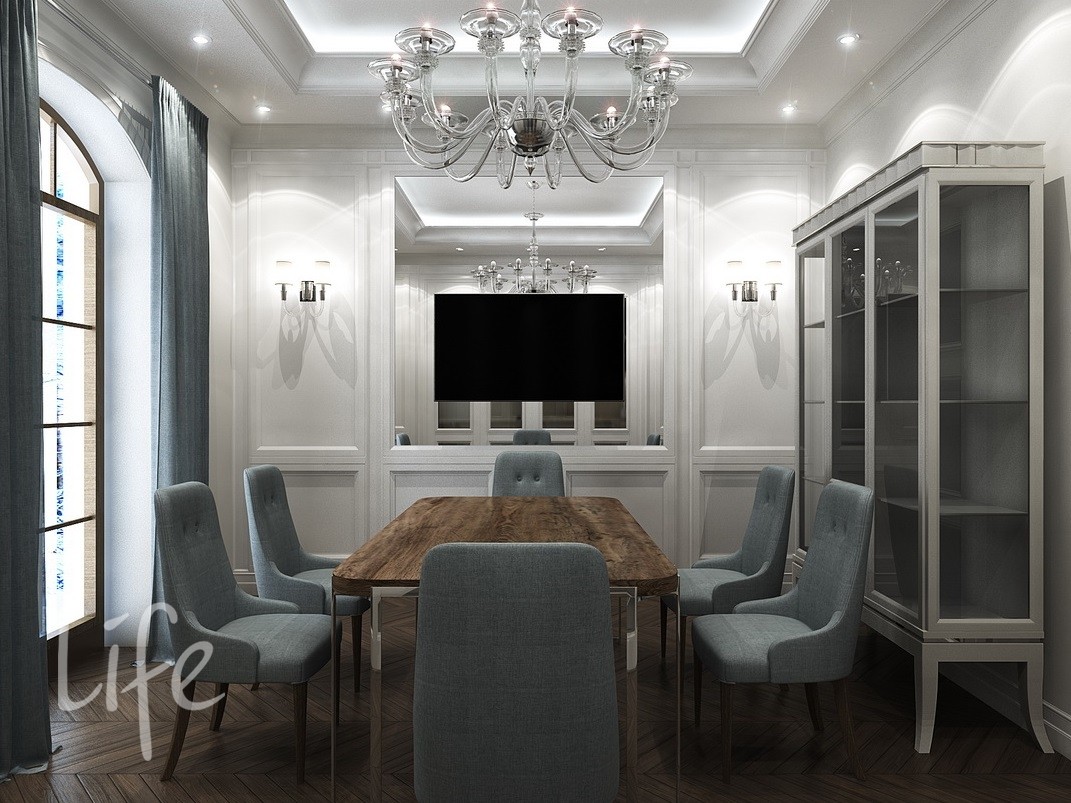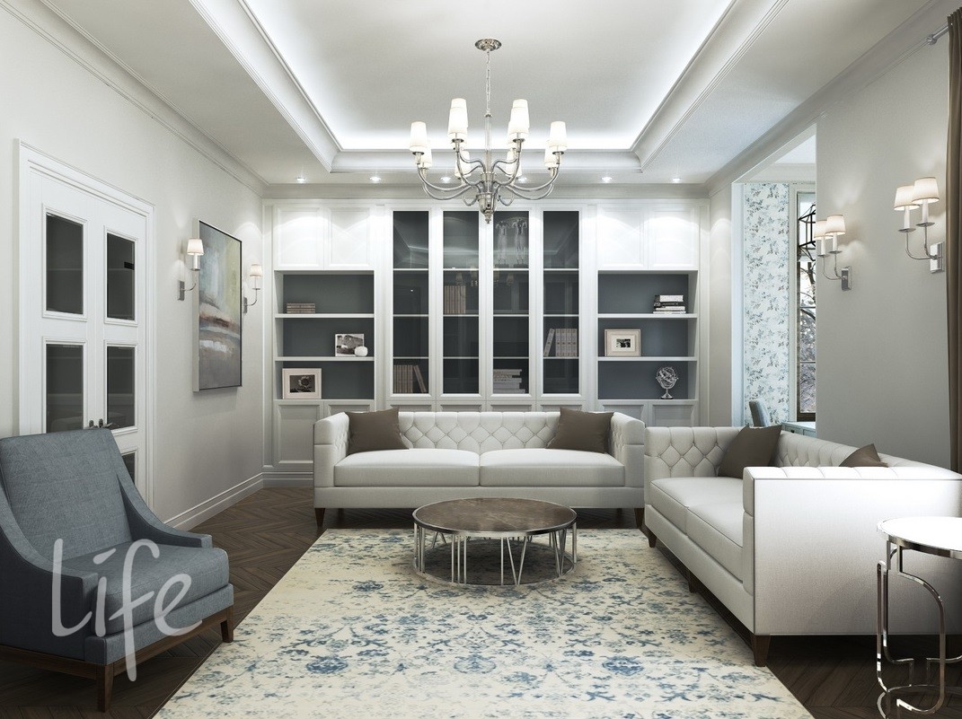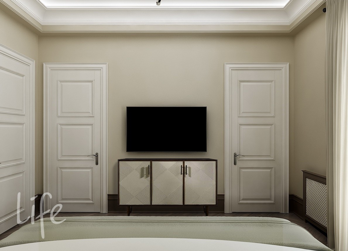 Интерьер выполнен в классическом стиле, в светлых мягких тонах, подобраны дорогая мебель и аксессуары.