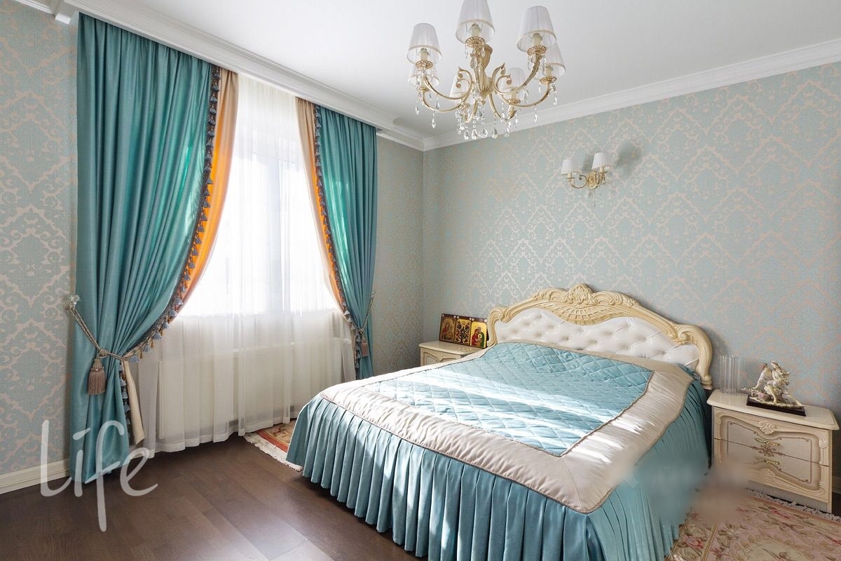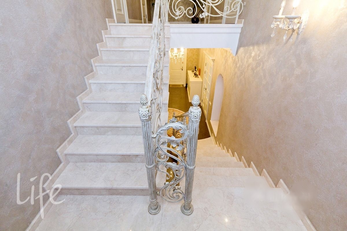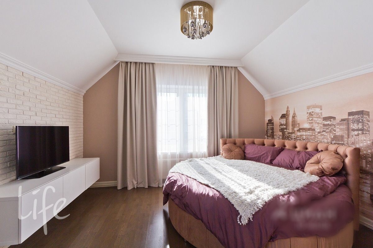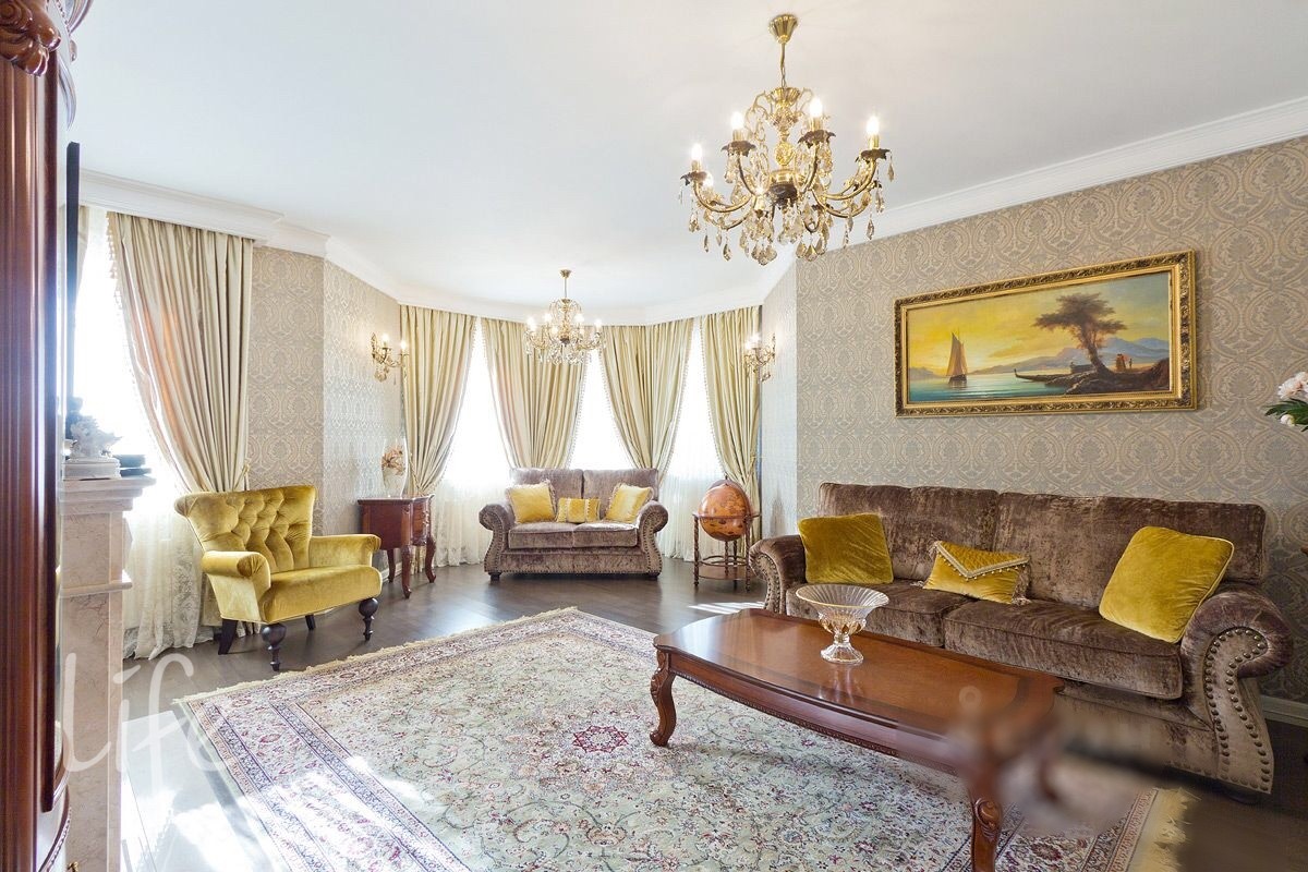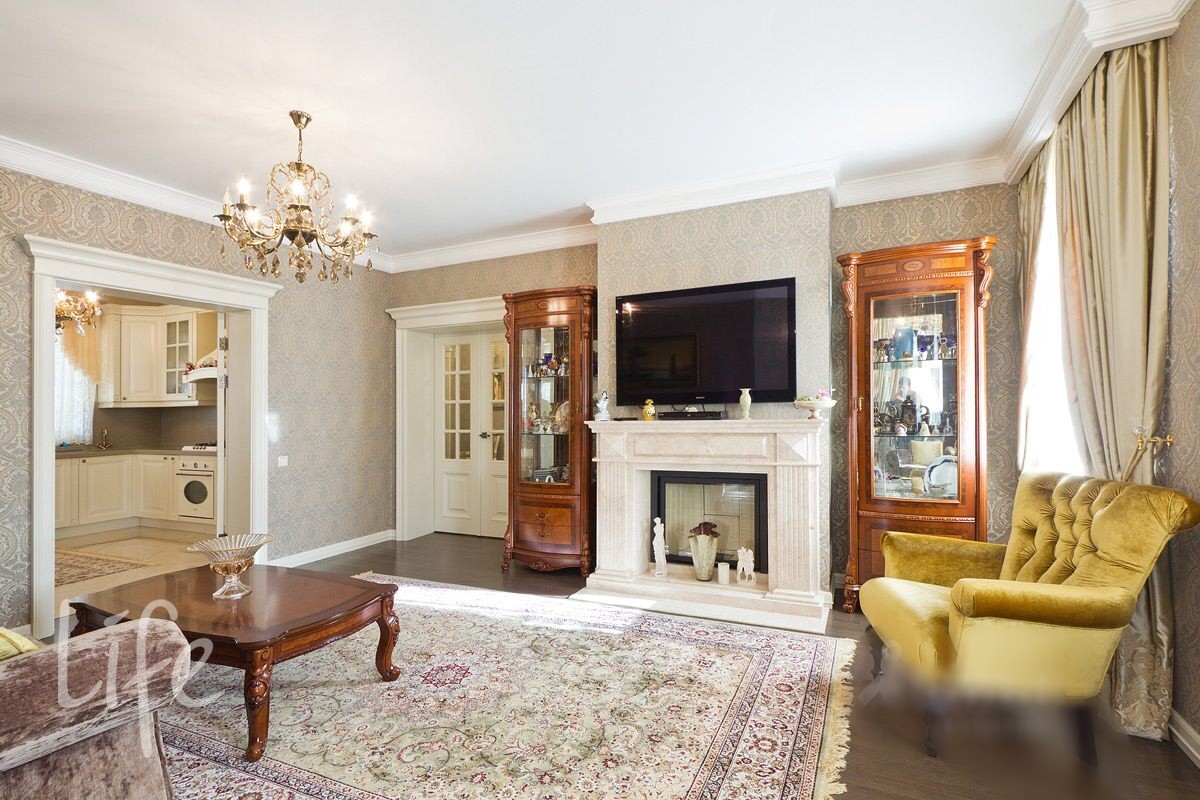 Интерьер выполнен в классическом стиле, в мягких светлых тонах, со вкусом подобрана мебель и аксессуары. Гостиную украшает действующий дровяной камин.
