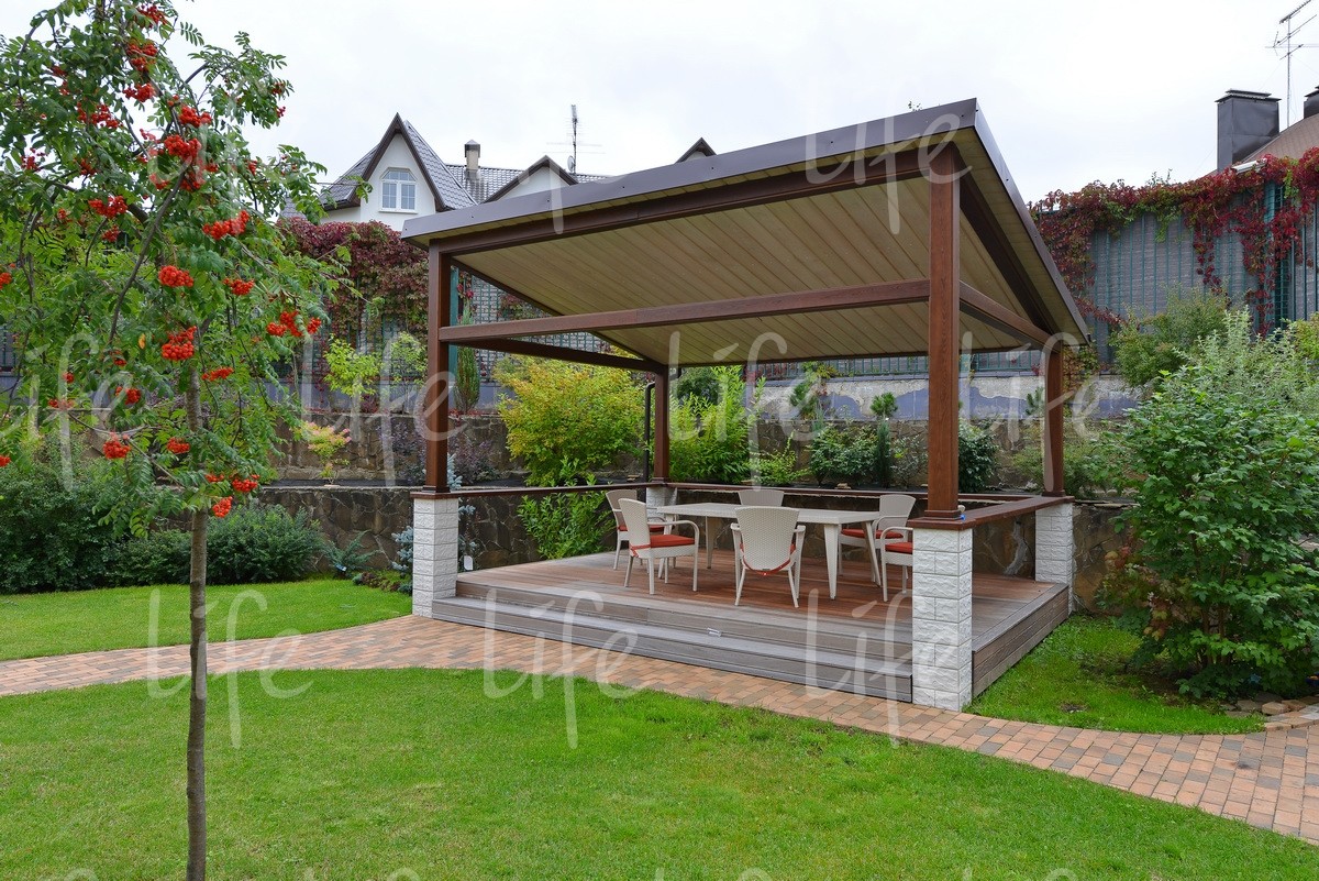 На участке терраса, беседка. Не смотря на то, что это таунхаус, участок достаточно приватен, зеленая изгородь отделяет соседей, кстати соседство только с одной стороны.