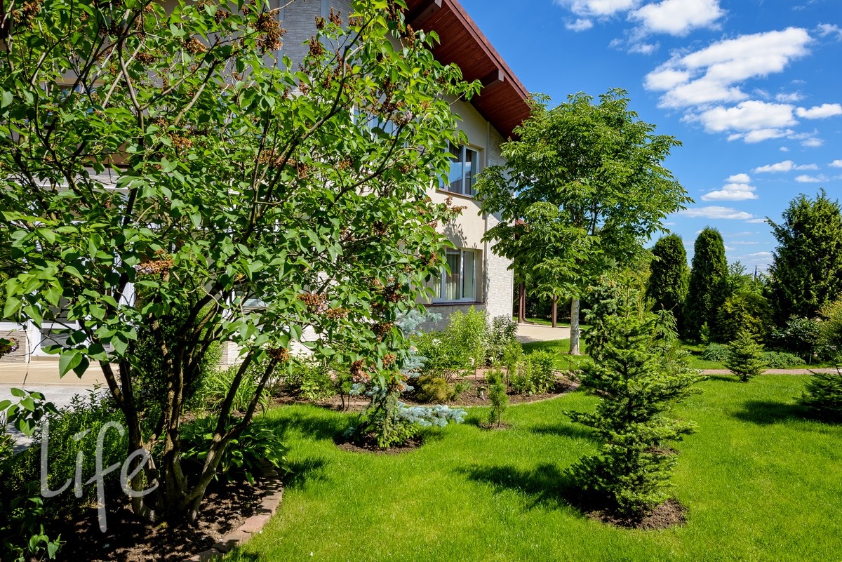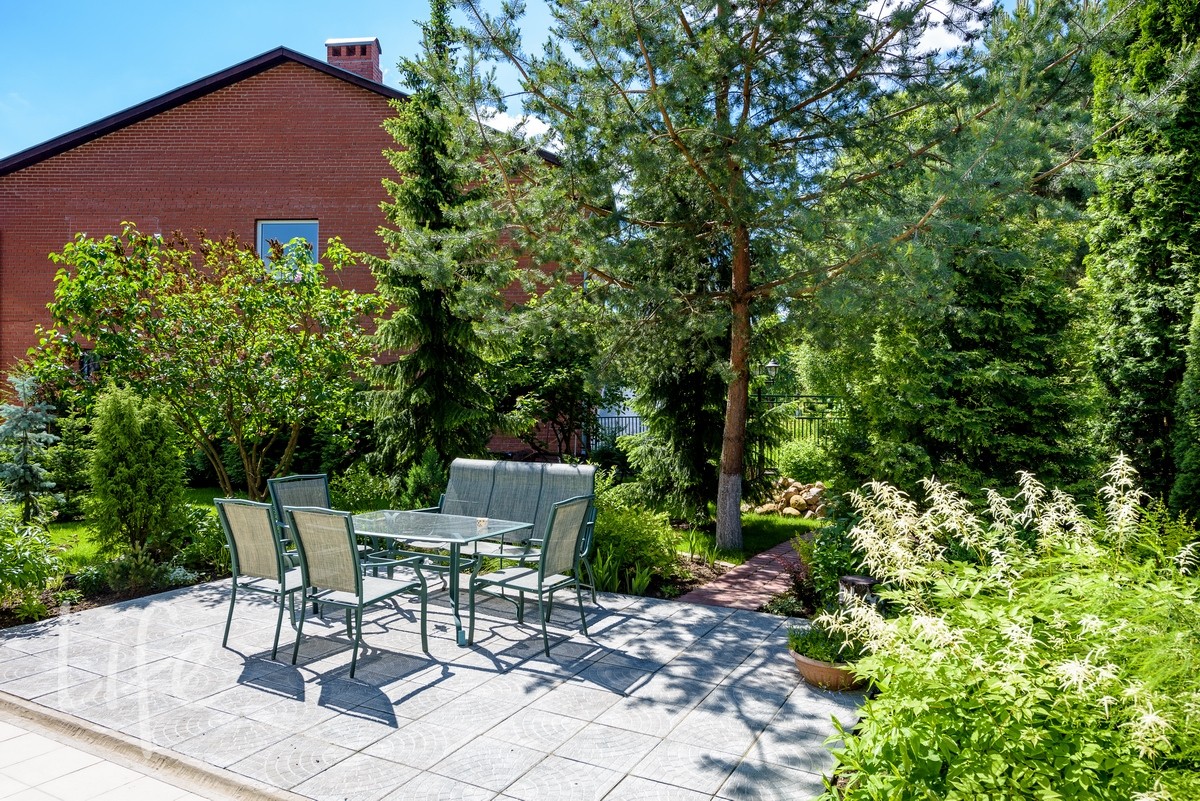 Участок правильной прямоугольной формы, ухоженный. Газон, декоративные деревья и кустарники, садовые деревья.