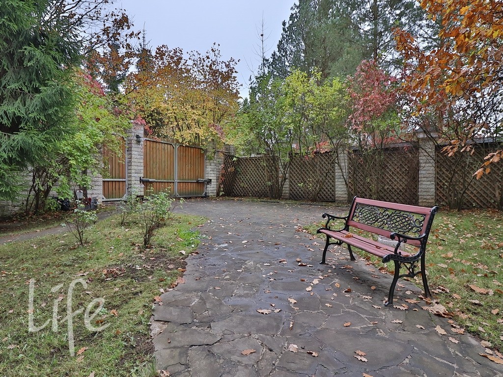 На участке парковочное место, дорожки, беседка с барбекю, елки и лиственные деревья. Очень тихое место.