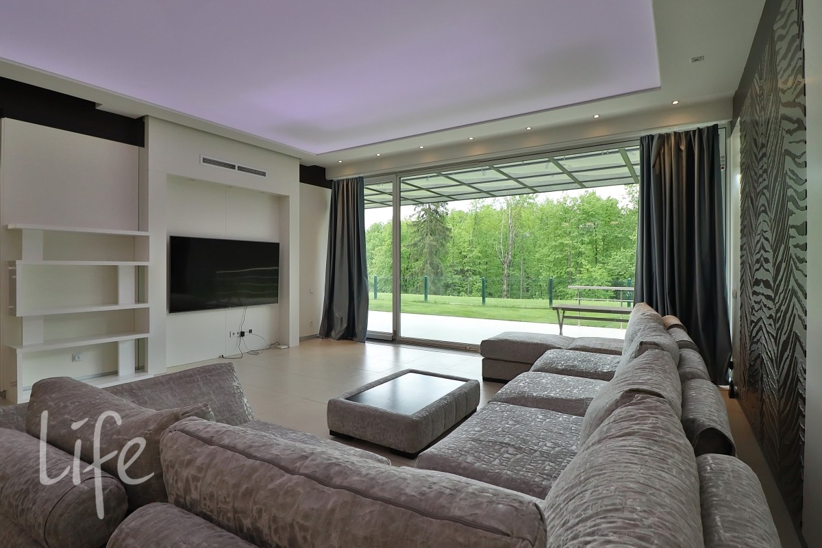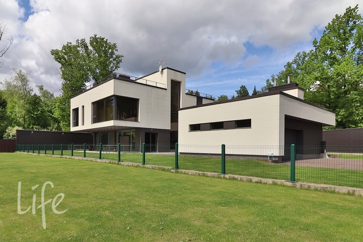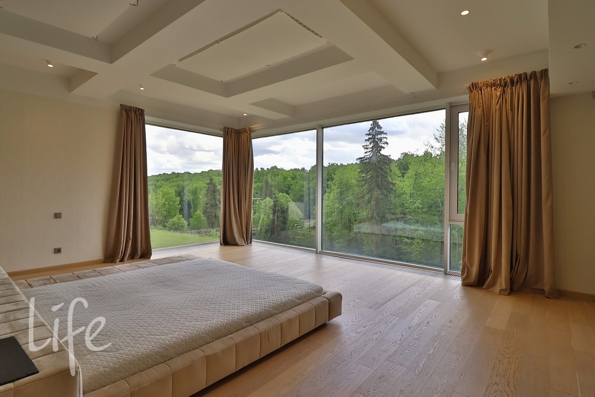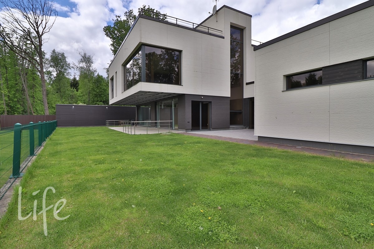 Коттеджный поселок «Новогорск-1». Дом расположен на краю холма с открывающимся великолепным видом на лесной массив. Полностью под ключ, меблирован и оборудован всей необходимой бытовой техникой. Современная архитектура, кубические формы, панорамное остекление. Комфортная планировка включает в себя зону гостиной-кухни-столовой, кабинета, мастер-спальни с панорамным видом на природу, двух спален, зону досуга в цоколе. Поселок охраняемый, детские площадки, лесные зоны для прогулок.
