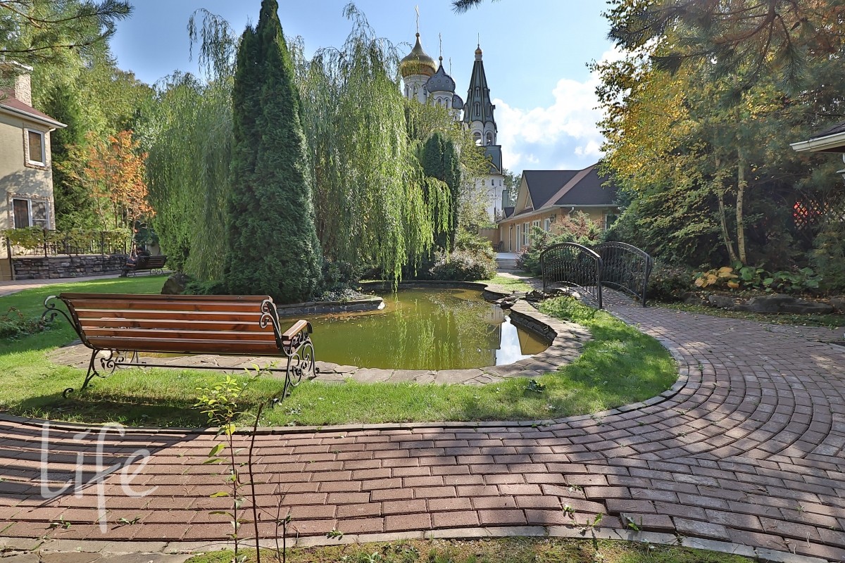 Участок правильной прямоугольной формы, лесной. Ландшафтный дизайн, дорожки, декоративные деревья, пруд. На территории расположен отдельно стоящий гараж на два автомобиля, дом с бильярдной и сауной, беседка. С участка открывается красивый вид на церковь.