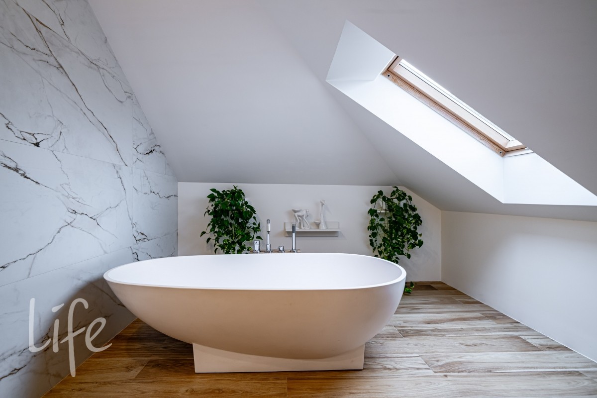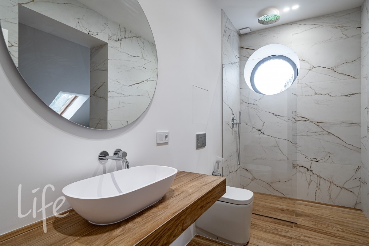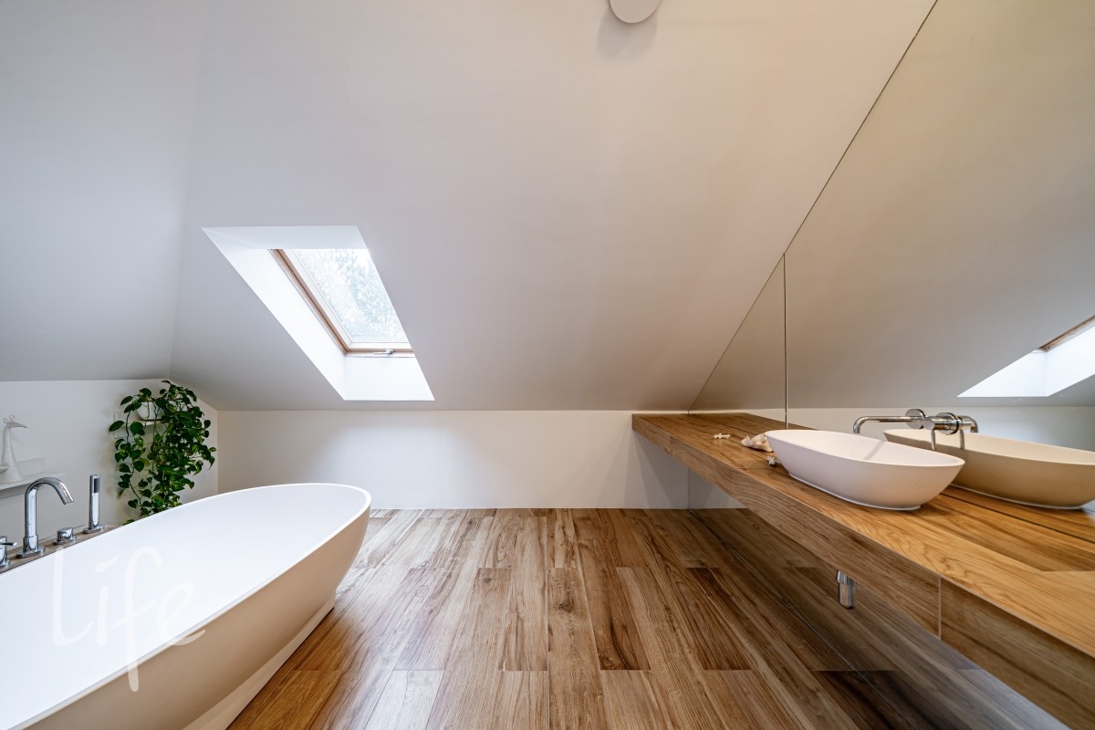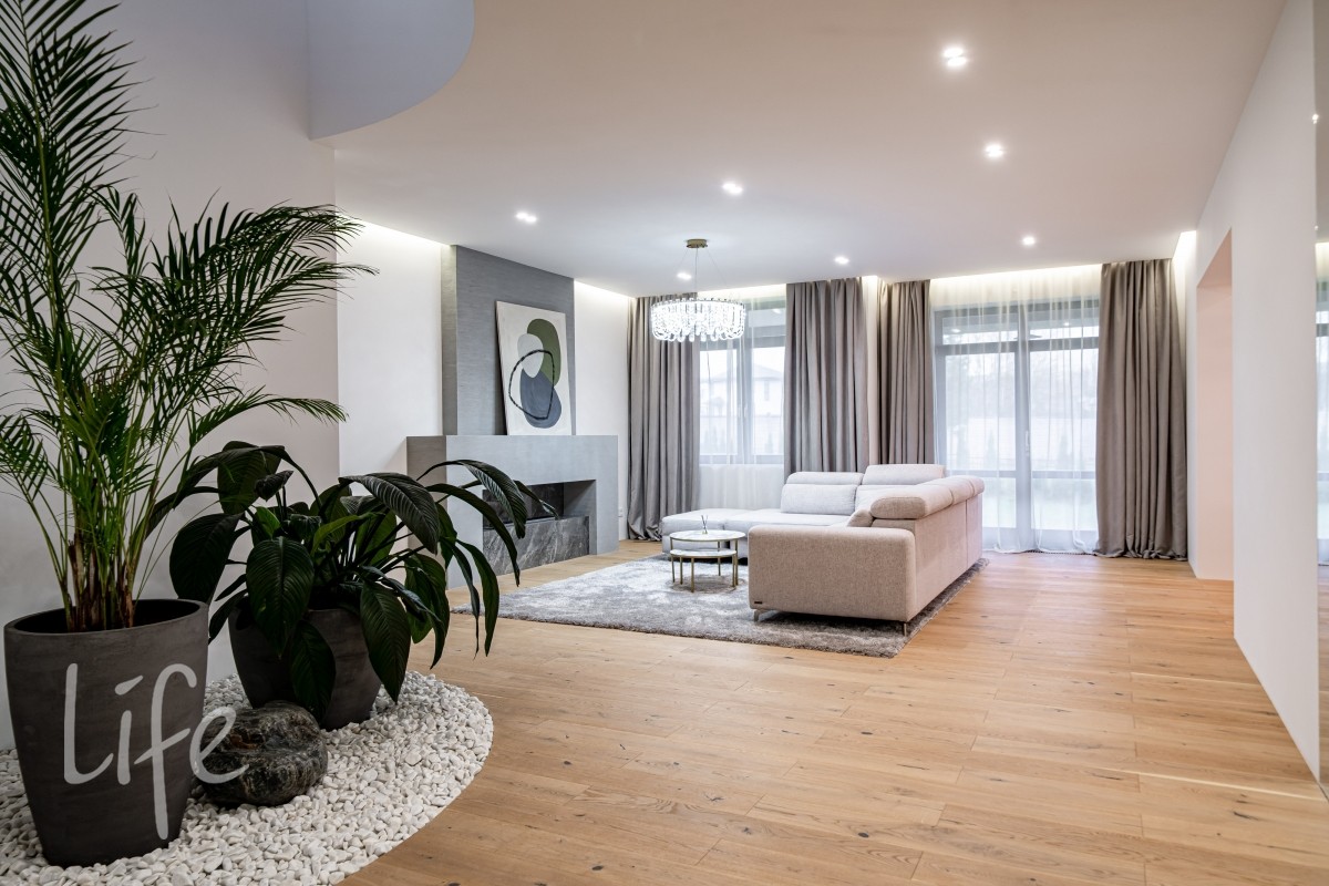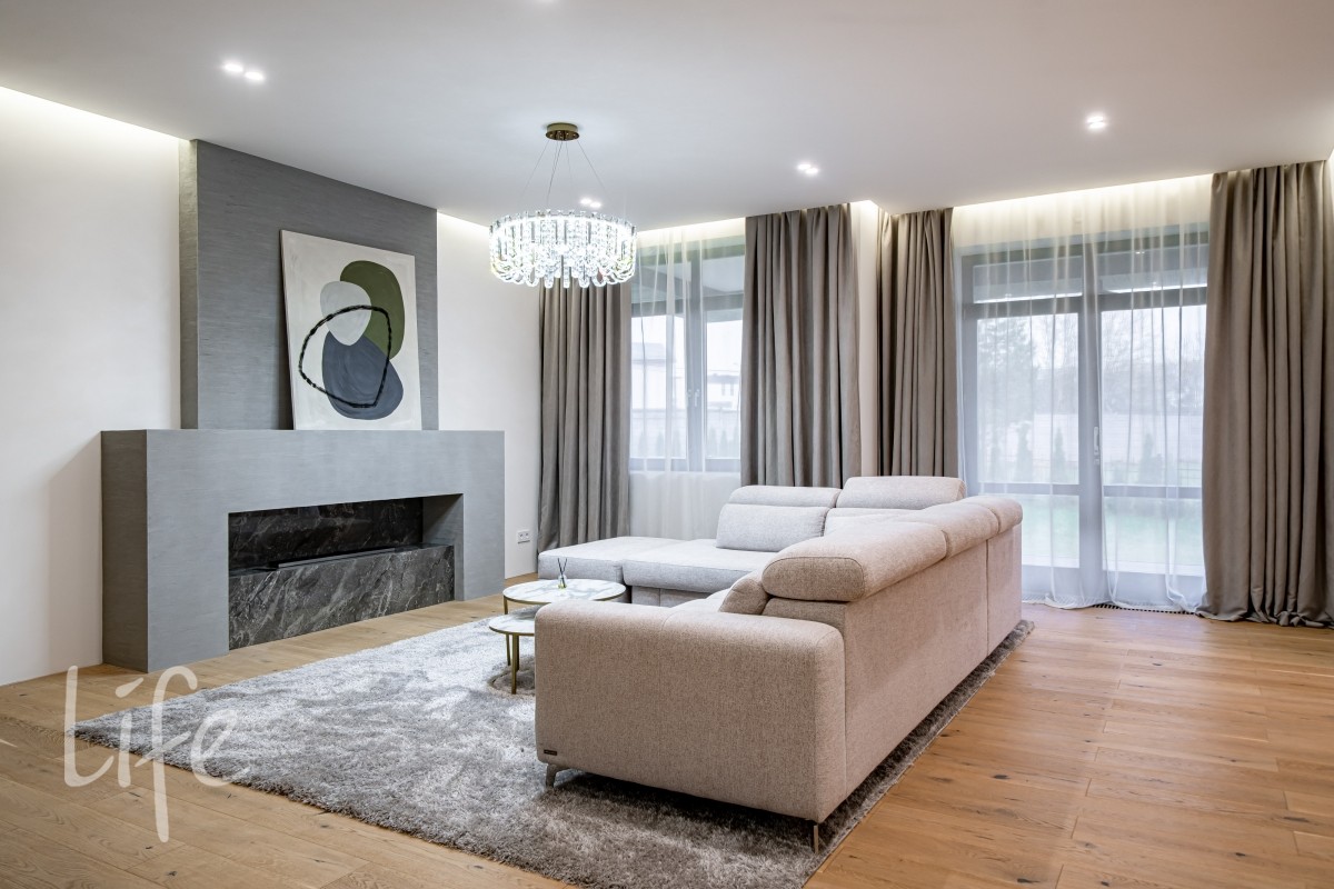 Гостиная с камином формирует центр домашнего сценария: панорамные окна, широкие проёмы и высокие потолки наполняют её мягким рассеянным светом. На полу — дубовый паркет с масляной обработкой, сантехника — английских брендов BAGNODESIGN London и VADO. Деревянные стеклопакеты усиливают ощущение тепла и создают визуальную связку с природой.