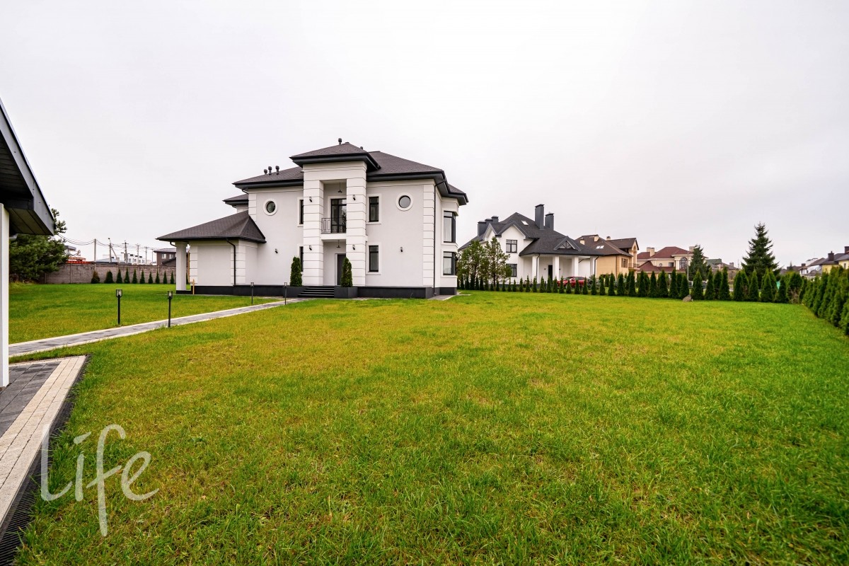 Участок благоустроен и аккуратно спланирован: газон, дорожки, автоматический полив. По периметру высажено более 100 туй, создающих приватную зелёную рамку. У въезда расположена крытая парковка для двух автомобилей.
