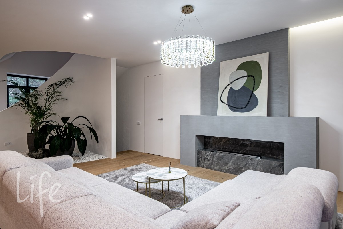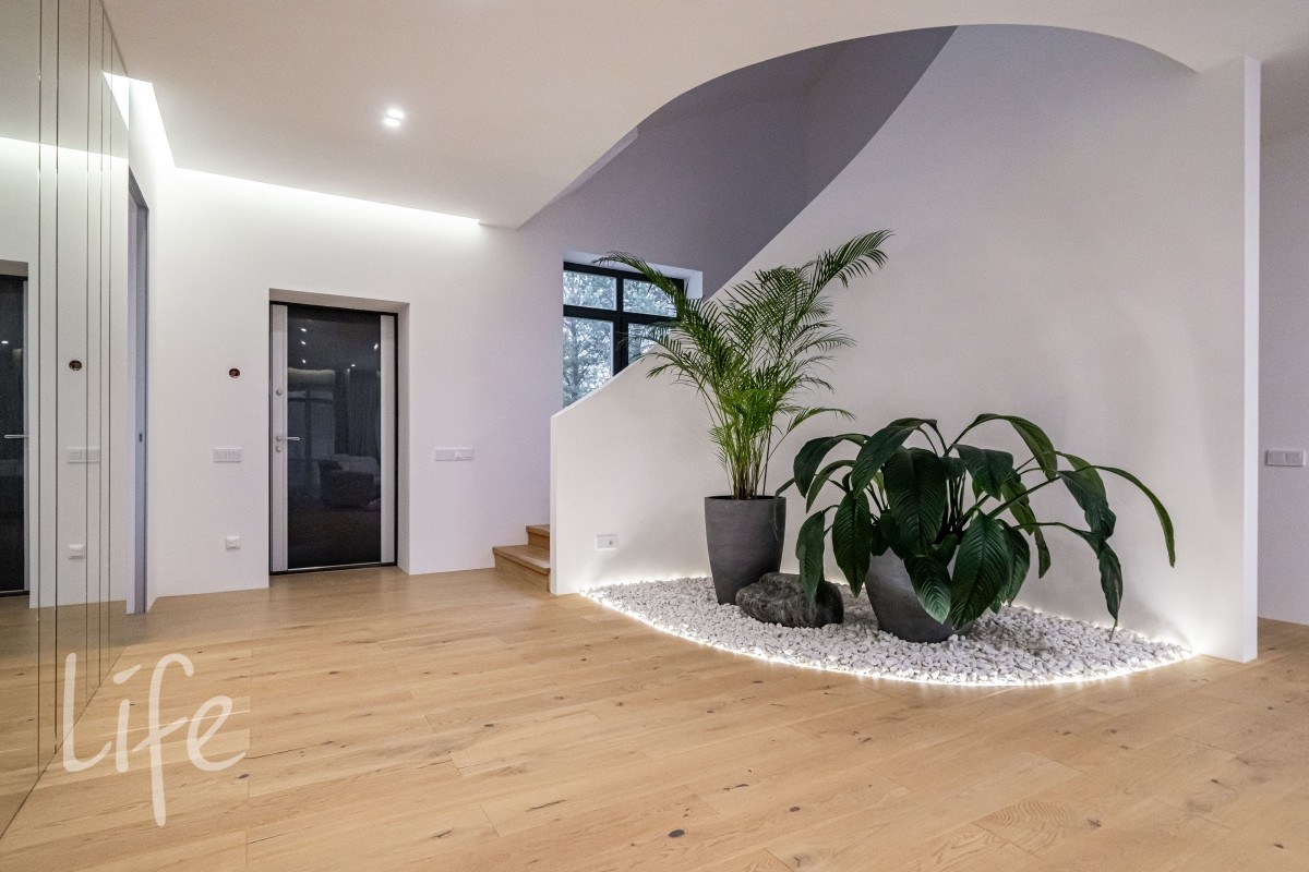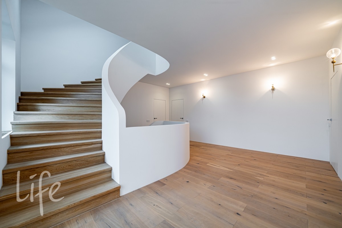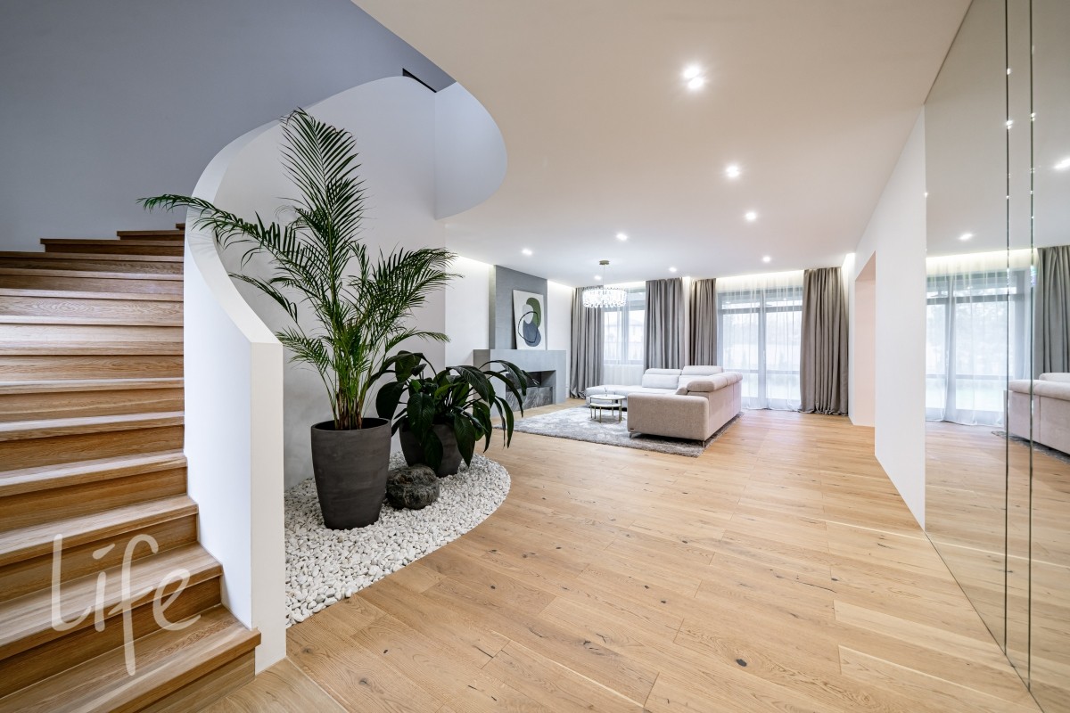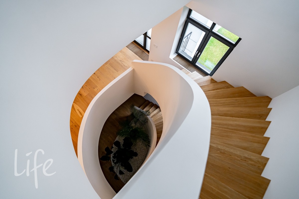 Интерьер оформлен в современном стиле с использованием натуральных материалов, спокойных тонов и продуманной геометрии. Крупная винтовая лестница задаёт выразительный ритм и объединяет уровни дома в единое пластичное движение.
