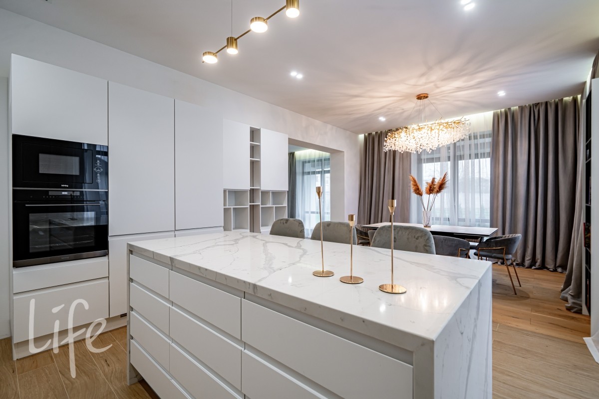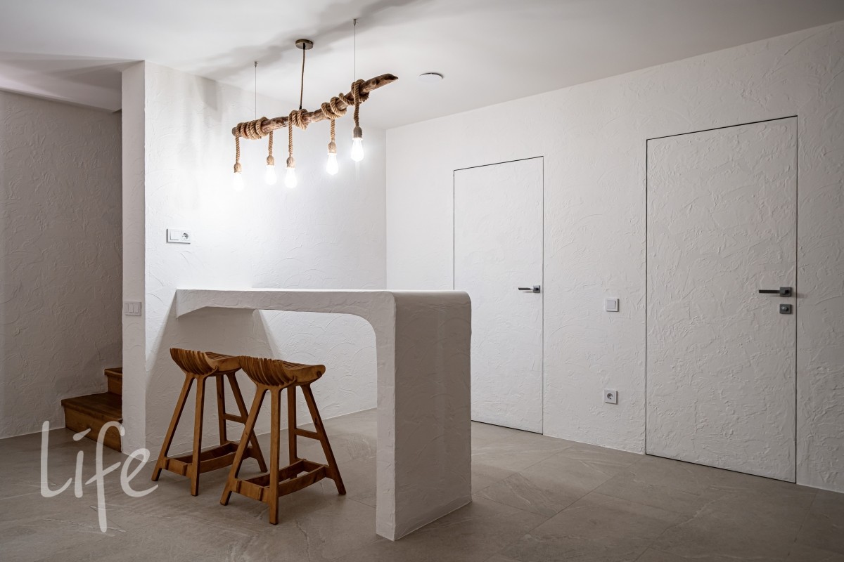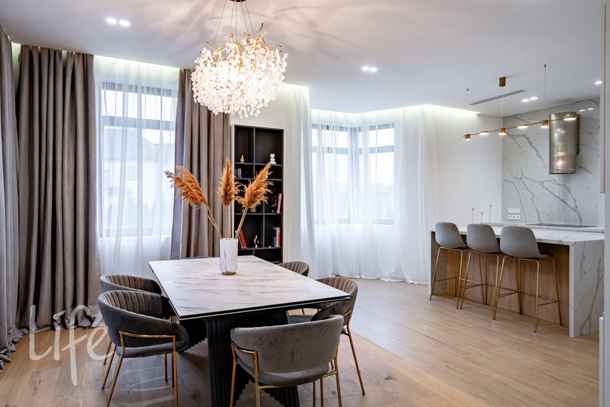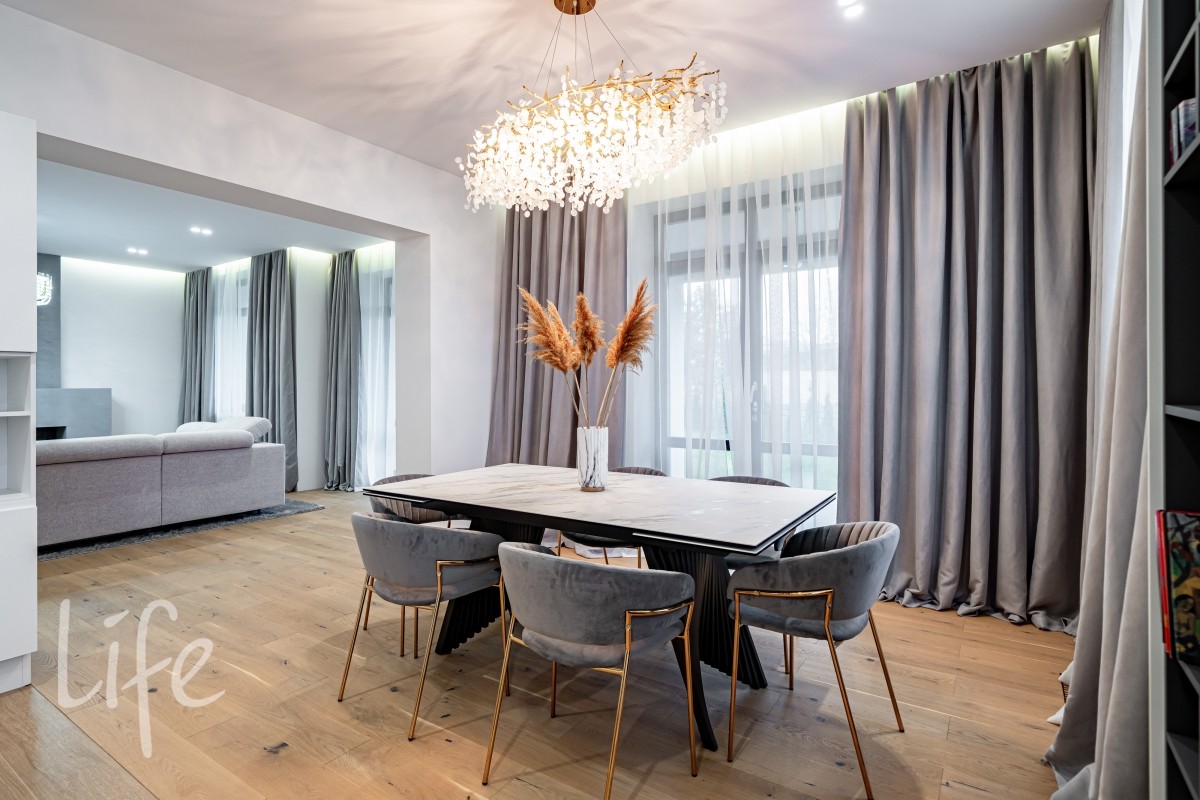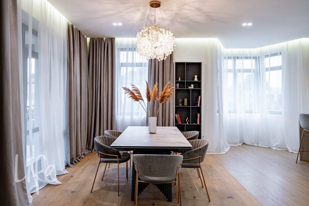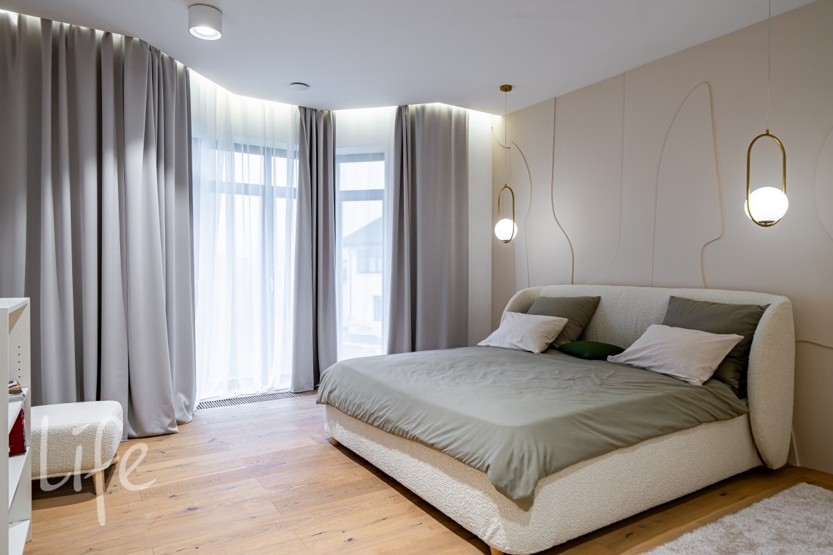 Интерьер оформлен в современном стиле с использованием натуральных материалов, спокойных тонов и продуманной геометрии. Крупная винтовая лестница задаёт выразительный ритм и объединяет уровни дома в единое пластичное движение.