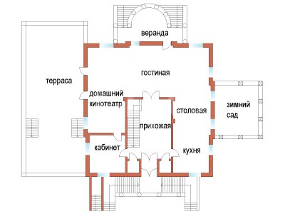 1 этаж: тамбур, прихожая, с/у, гардероб, кабинет, кухня, столовая, домашний кинотеатр, гостиная, зимний сад, веранда, терраса.