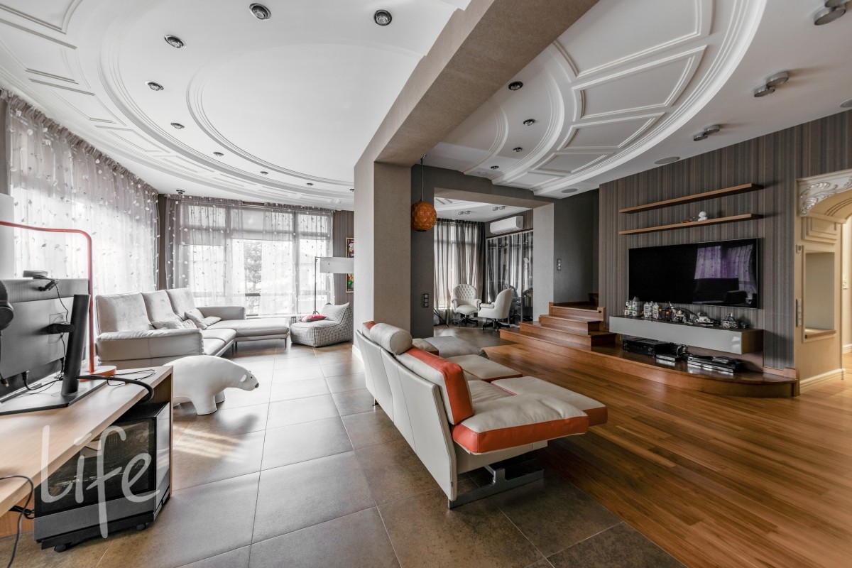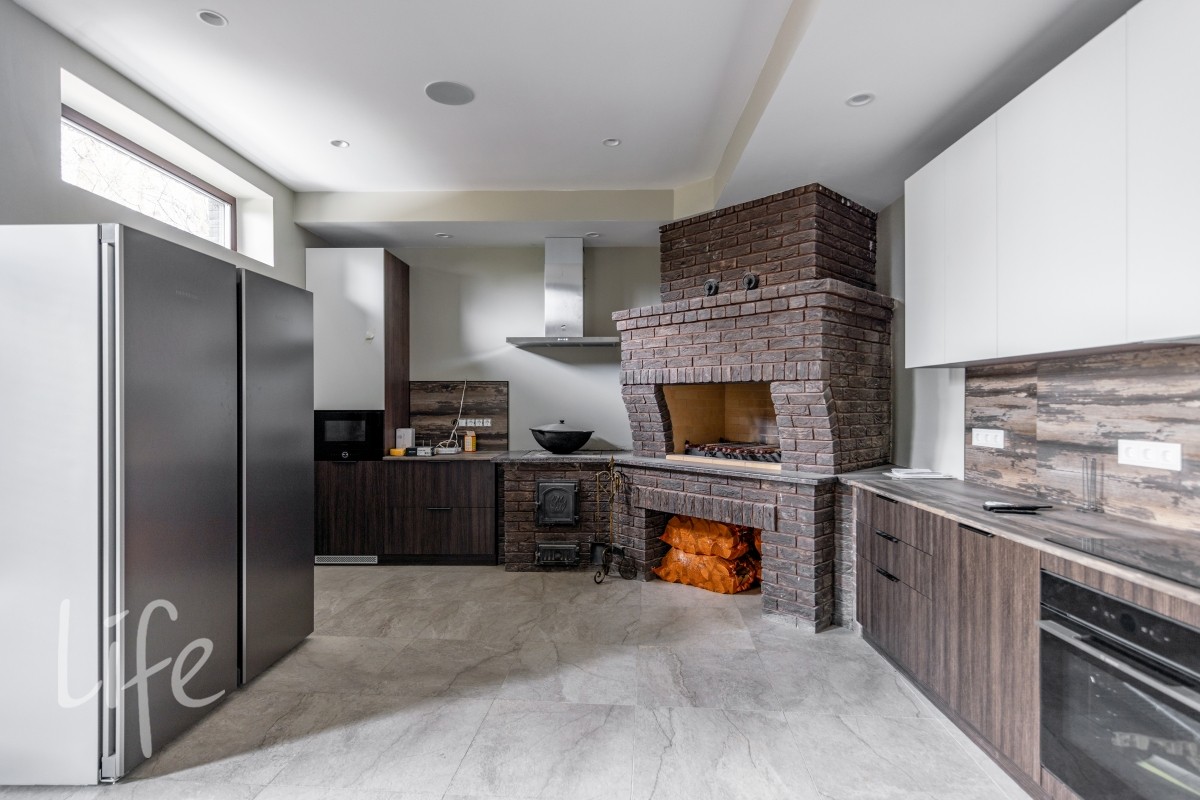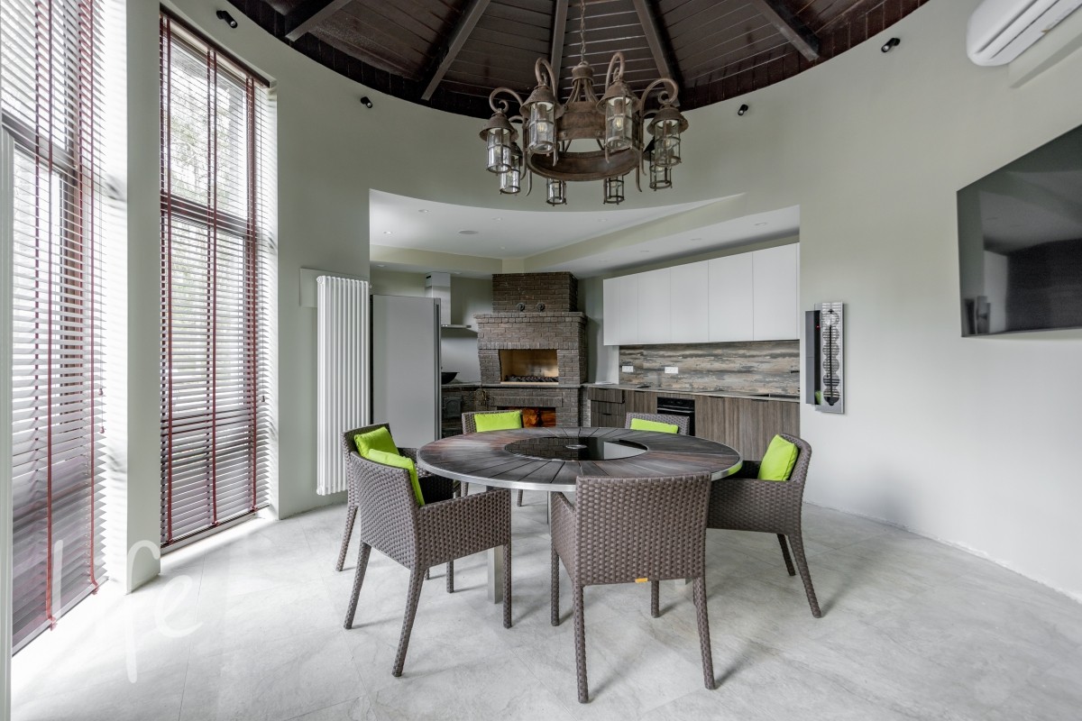 1 этаж: гостиная с камином и вторым светом, кухня-столовая с выходом на террасу, холл, кабинет, гостевая спальня с су, прихожая с гардеробной, зона персонала (постирочная, гардероб, котельная с отдельным входом), гараж на 2 мм. выходы на открытую террасу из гостиной и столовой.