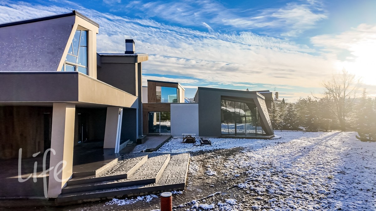 Архитектура выполнена в современном стиле с выразительными ломанными линиями, масштабными окнами в полный рост и высокими стеновыми плоскостями, подчеркивающими динамику объёмов. Панорамное остекление и второй свет формируют редкий по масштабу эффект глубины и воздуха.