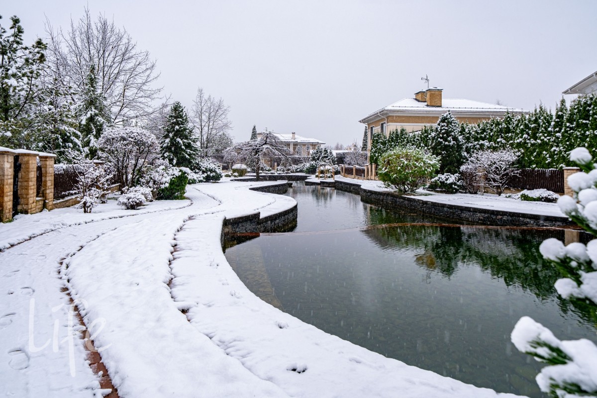 Участок площадью выходит к водному каналу и окружён зрелыми хвойными деревьями, создающими приватность и мягкое природное обрамление. Предусмотрены закрытые и открытые
