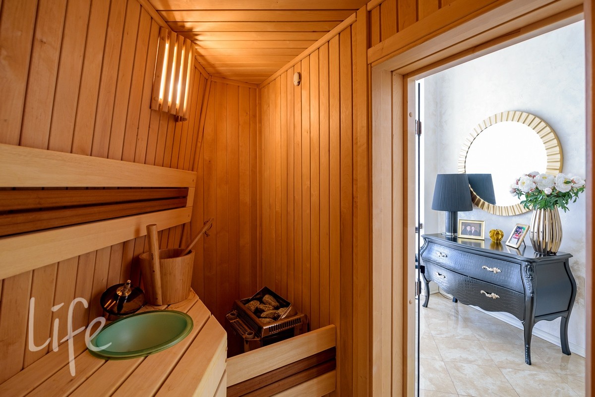 Мансарда: холл, хозяйская зона с библиотекой, спальня, гардеробная, с/у, сауна с функциями хамама.