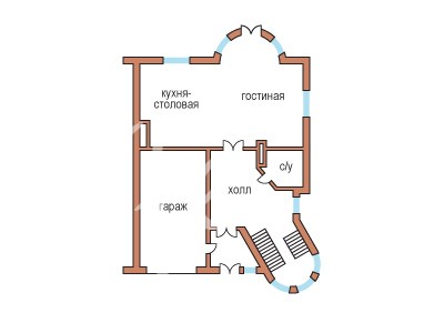 1 этаж: тамбур, холл, кухня-столовая, гостиная с камином и выходом на участок, с/у, гараж.