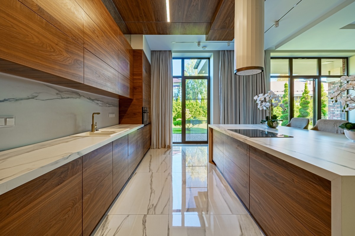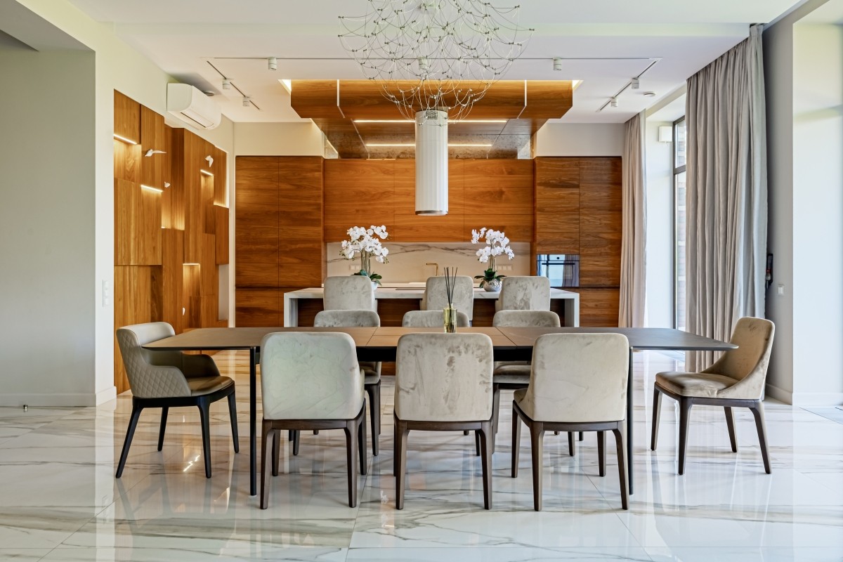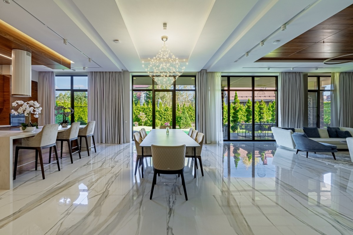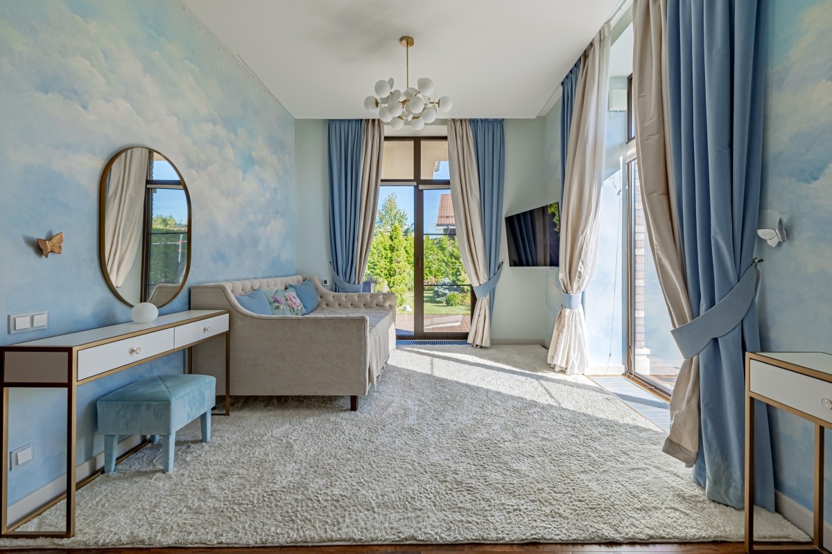 Интерьер выполнен в современном стиле, мебель из коллекций «Minotti» и «BAXTER», со вкусом подобраны аксессуары и предметы быта. Благодаря панорамным окнам в доме всегда светло и атмосферно.