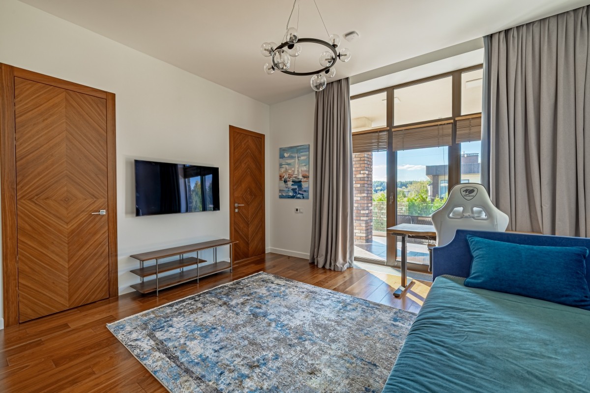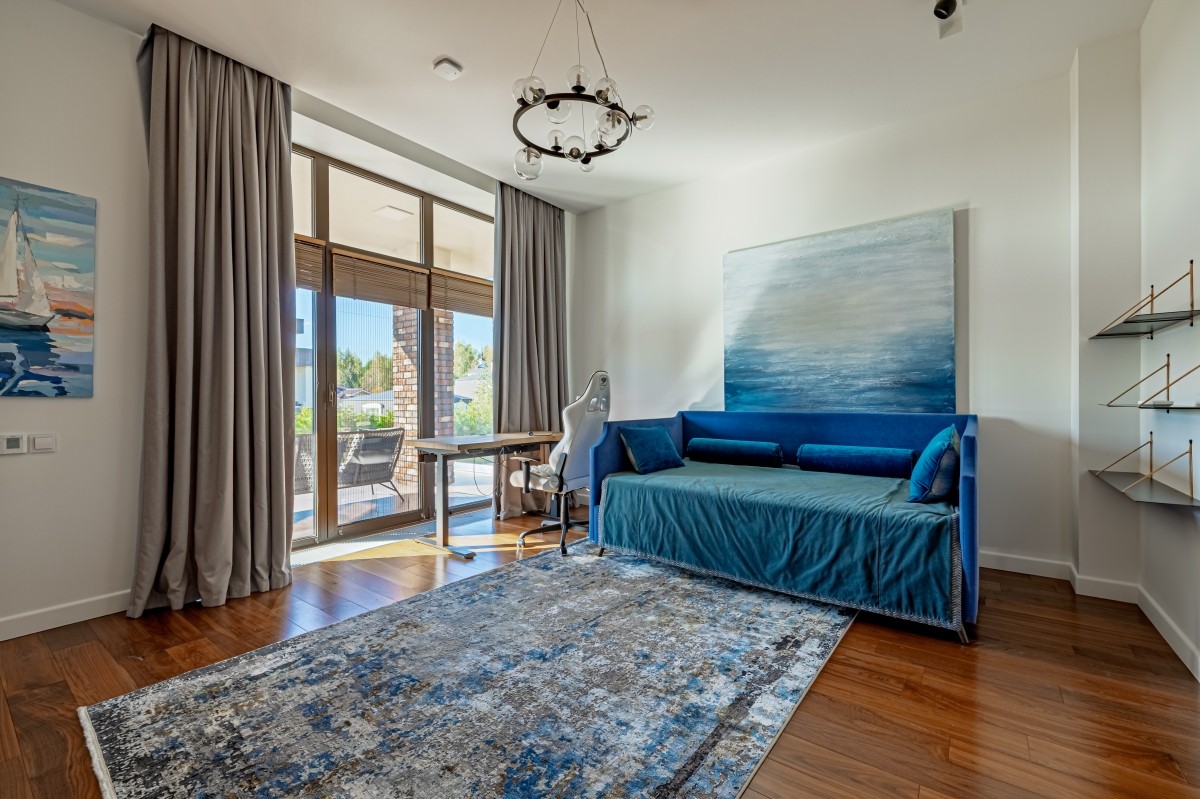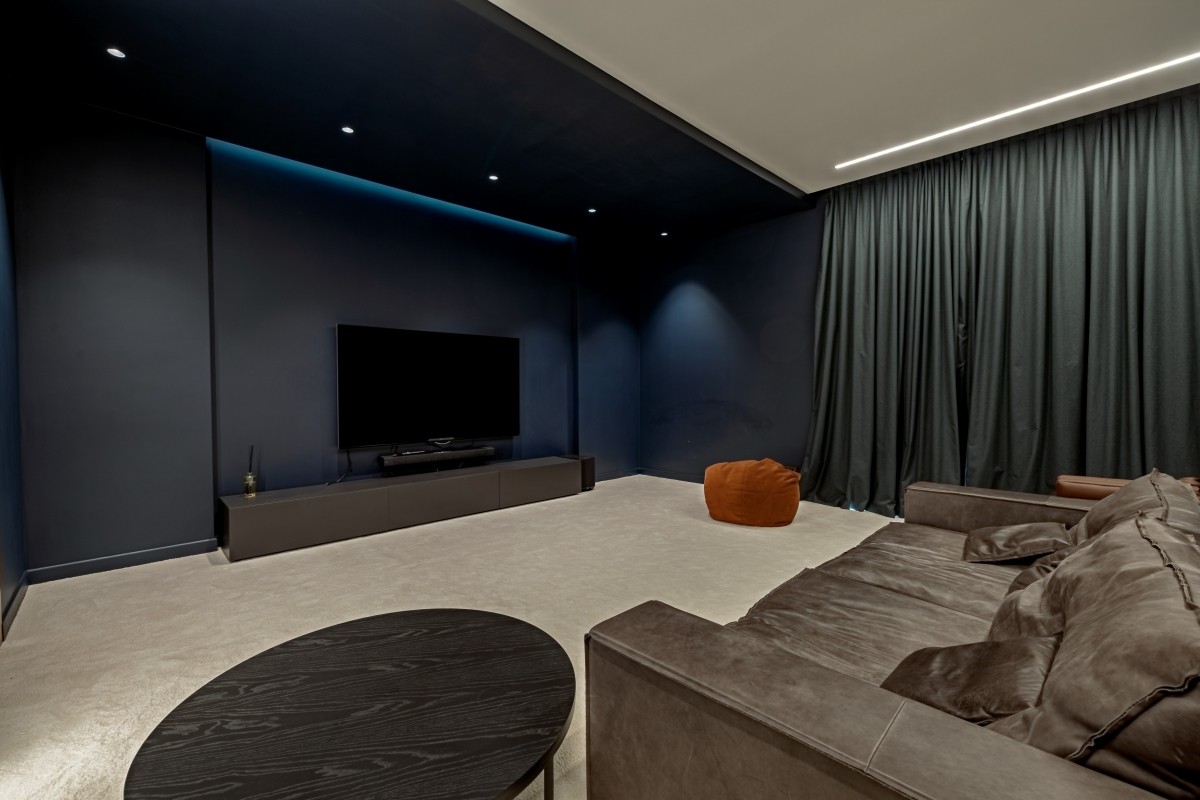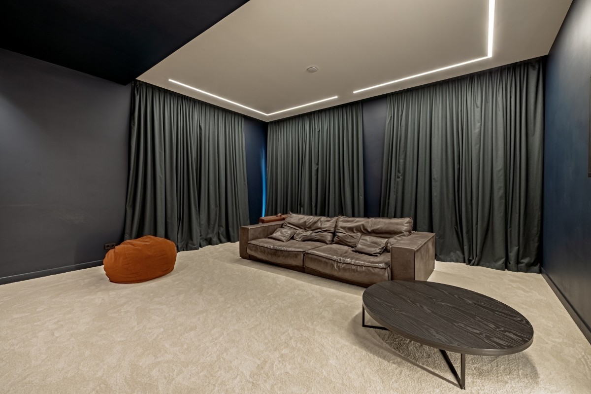 Дом удобно спланирован: четыре спальни, гостиная, домашний кинотеатр, фитнес-зал. Это делает проживание комфортным.