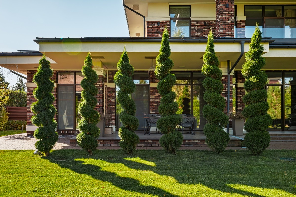 Участок правильной прямоугольной формы, выполнен ландшафтный дизайн. По периметру участка, вдоль забора, посажены туи, создающие приватное пространство. Газон, кустарники, хвойные и плодовые деревья. Автоматический полив. На территории расположена спортивная площадка, зона барбекю, оборудованная садовой мебелью.
