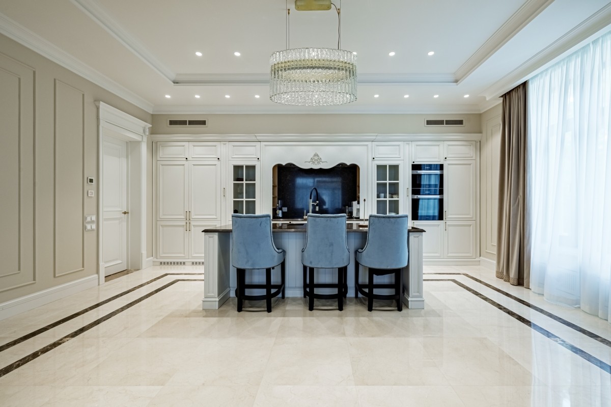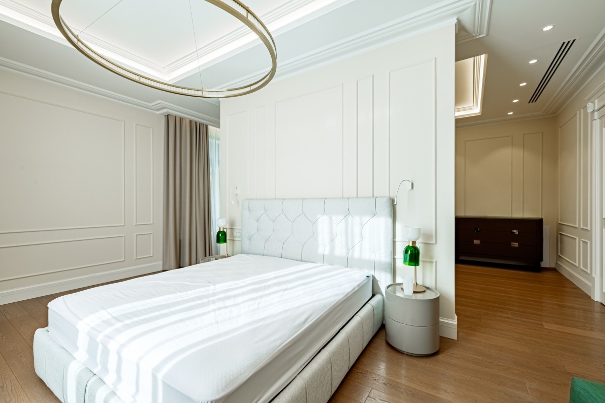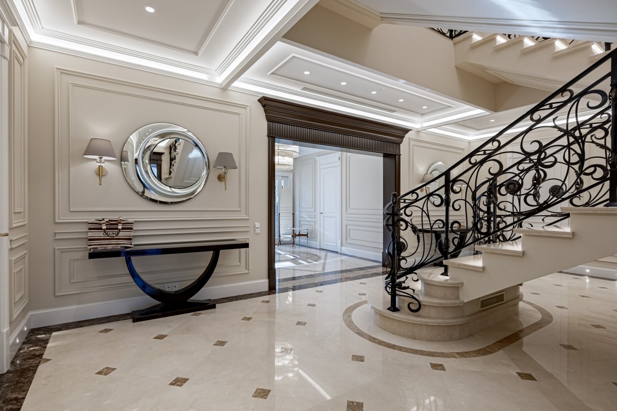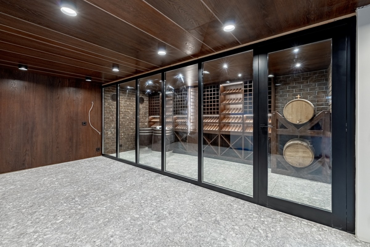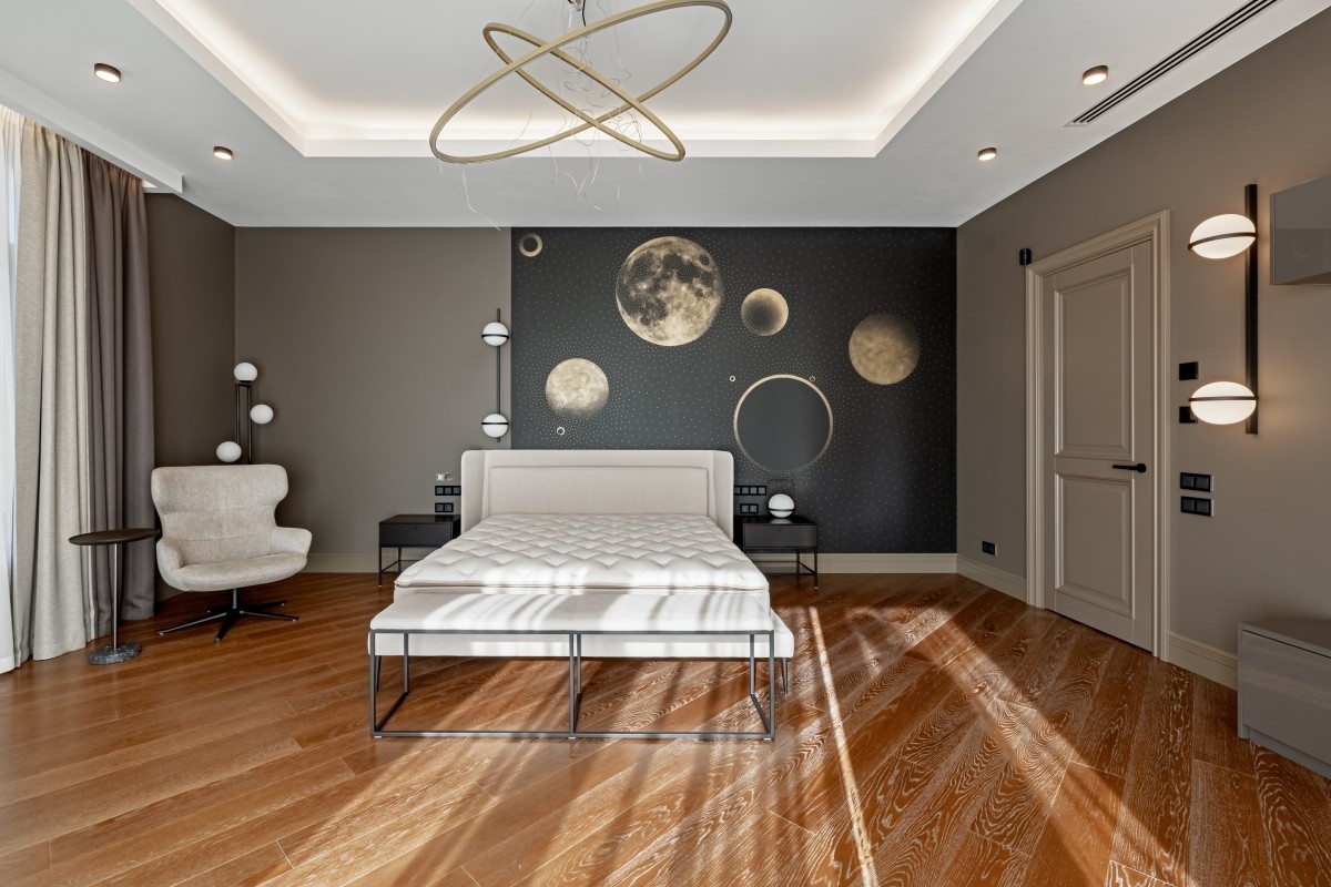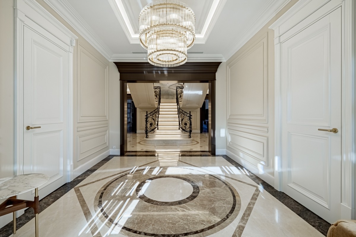 Интерьер выполнен в современном классическом стиле, в мягких постельных тонах, панорамные окна пропускают много света, делая пространство визуально шире. Со вкусом подобрана мебель и аксессуары, передовые световые решения. Гостиную украшает двухсторонний дровяной камин. Зона СПА с бассейном, джакузи, сауной и хамамом скрасят будни владельцев. Винный погреб заслуживает особого внимания.