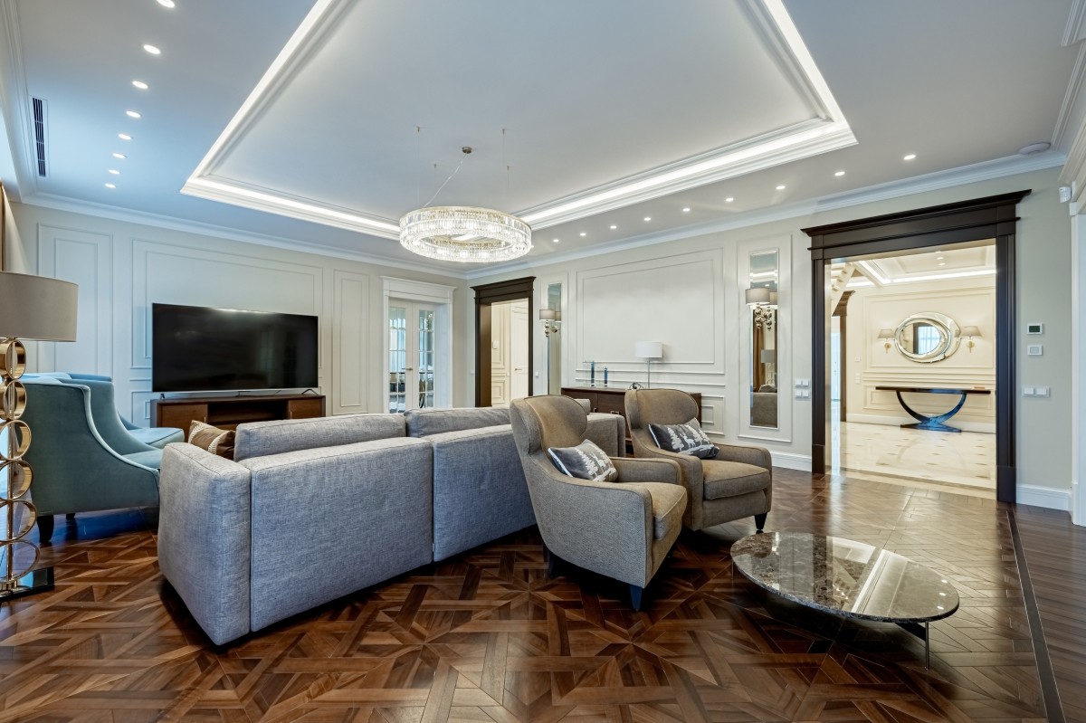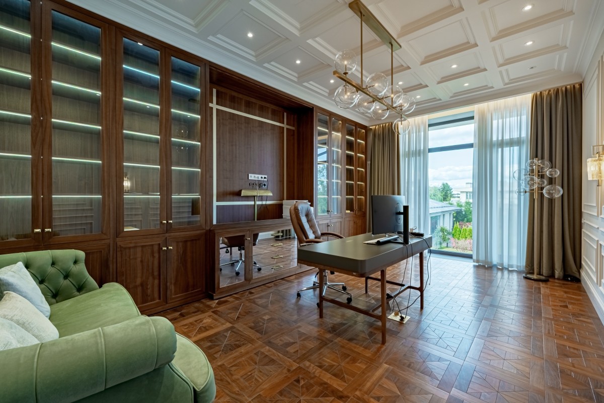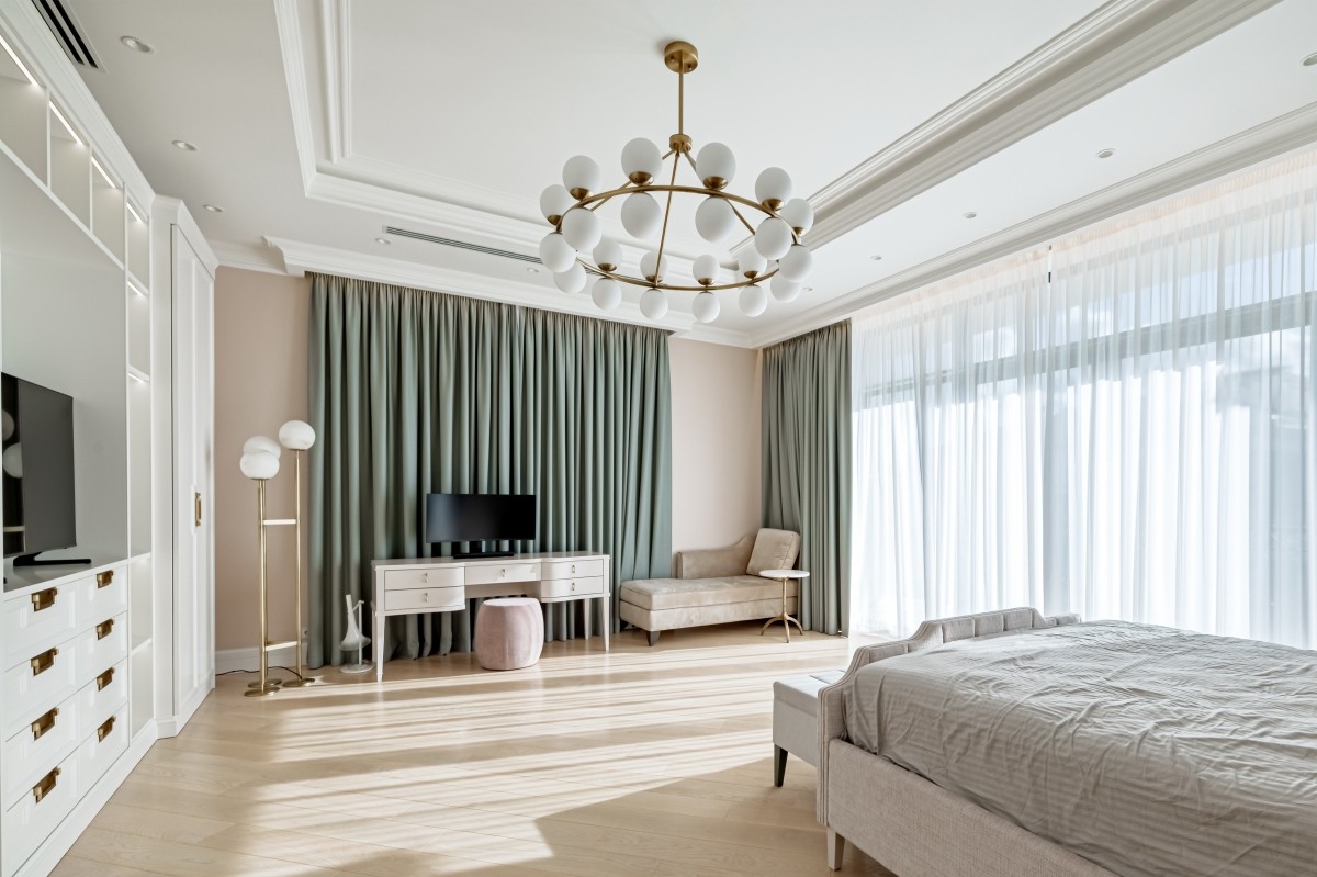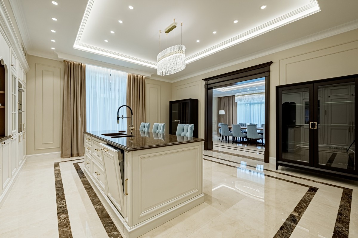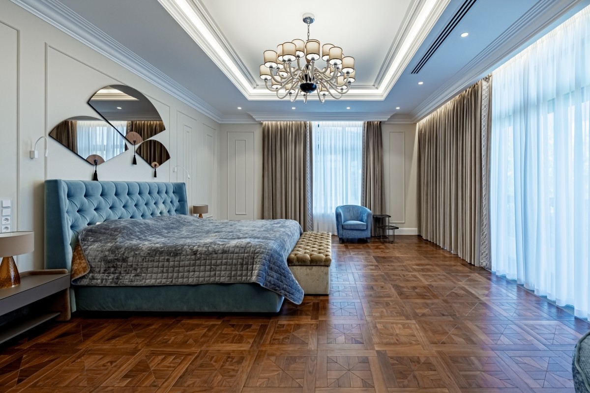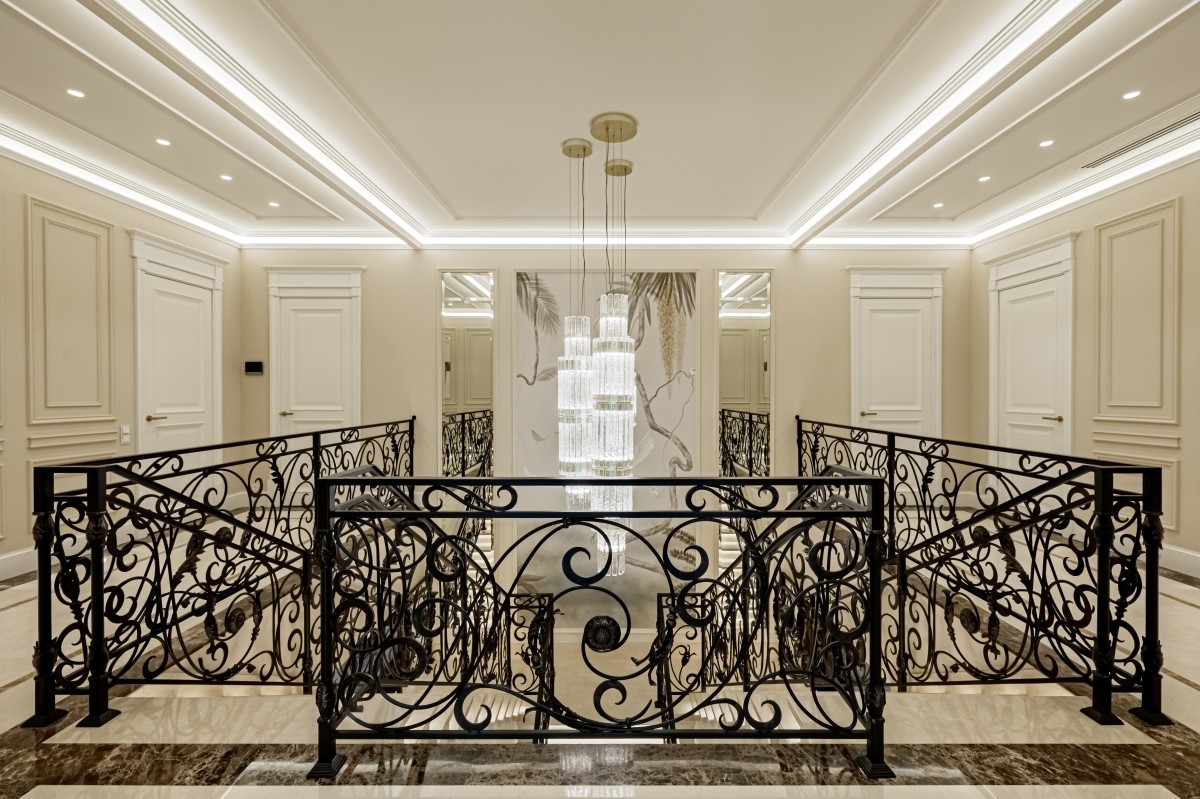 Интерьер выполнен в современном классическом стиле, в мягких постельных тонах, панорамные окна пропускают много света, делая пространство визуально шире. Со вкусом подобрана мебель и аксессуары, передовые световые решения. Гостиную украшает двухсторонний дровяной камин. Зона СПА с бассейном, джакузи, сауной и хамамом скрасят будни владельцев. Винный погреб заслуживает особого внимания.