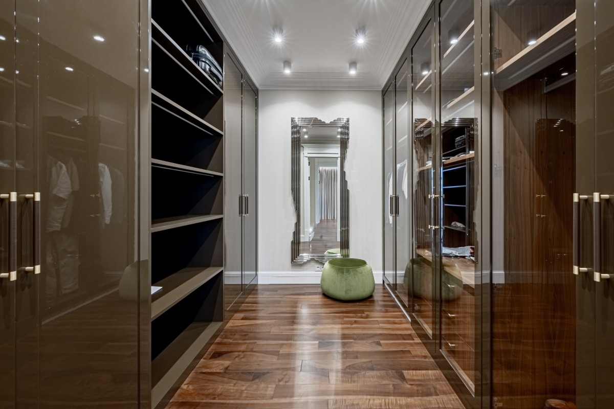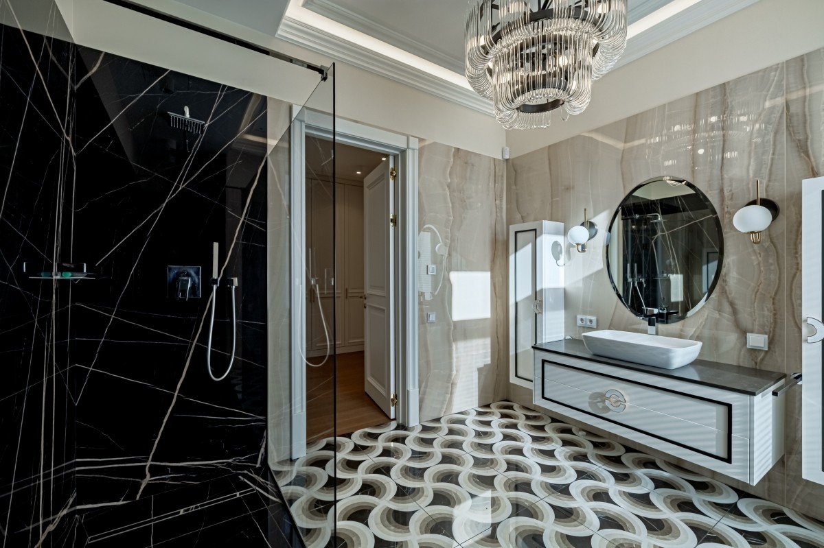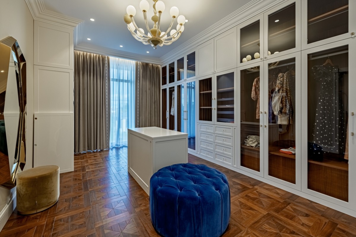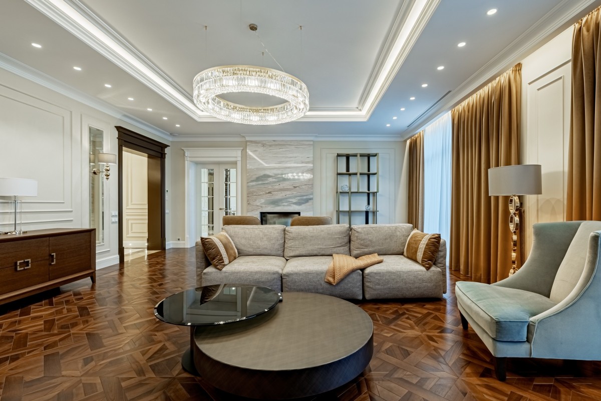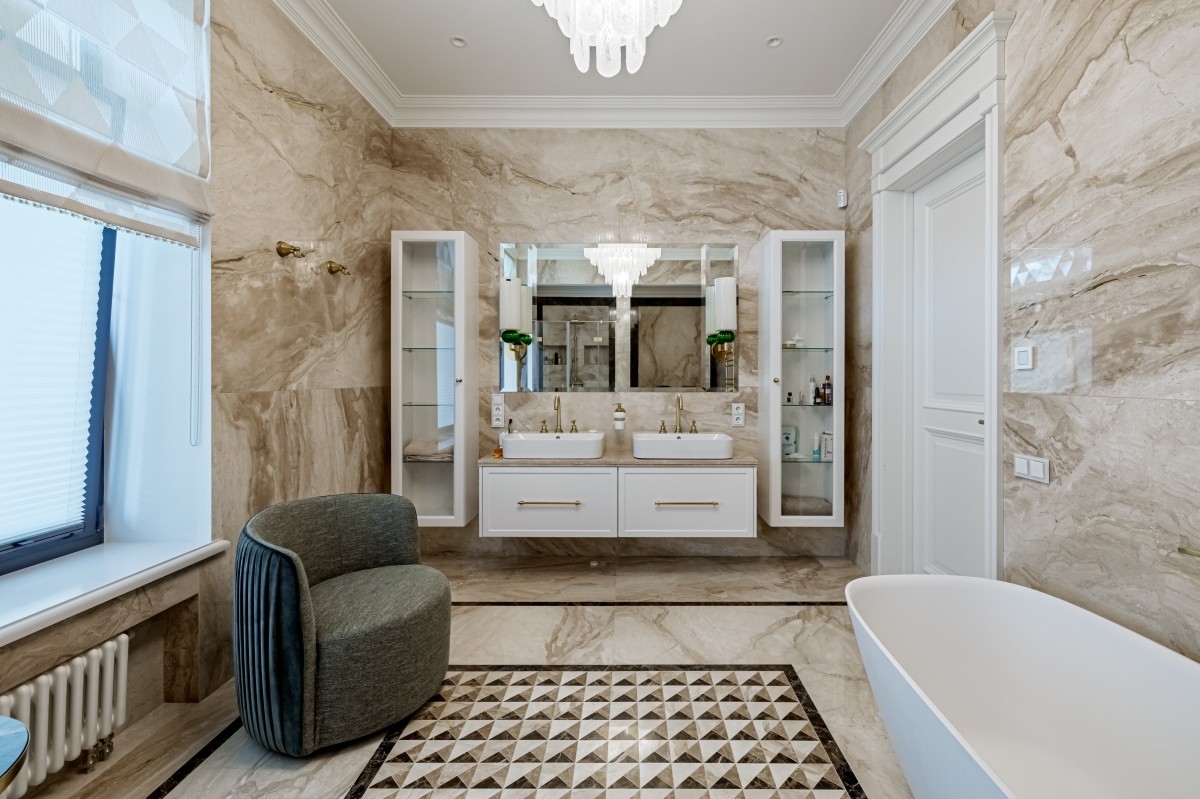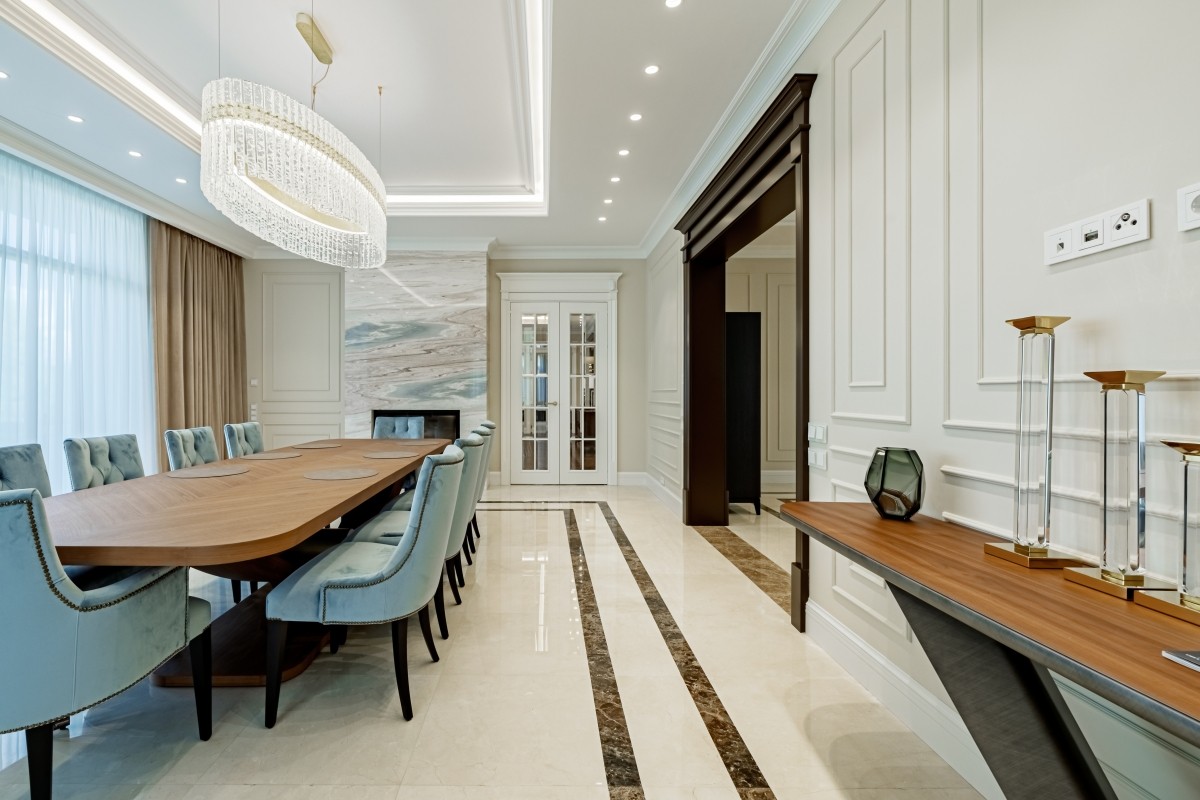 Интерьер выполнен в современном классическом стиле, в мягких постельных тонах, панорамные окна пропускают много света, делая пространство визуально шире. Со вкусом подобрана мебель и аксессуары, передовые световые решения. Гостиную украшает двухсторонний дровяной камин. Зона СПА с бассейном, джакузи, сауной и хамамом скрасят будни владельцев. Винный погреб заслуживает особого внимания.