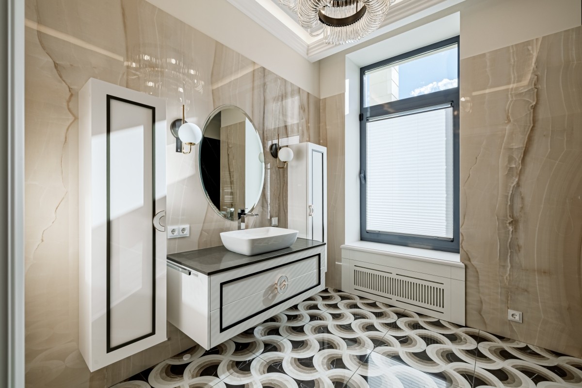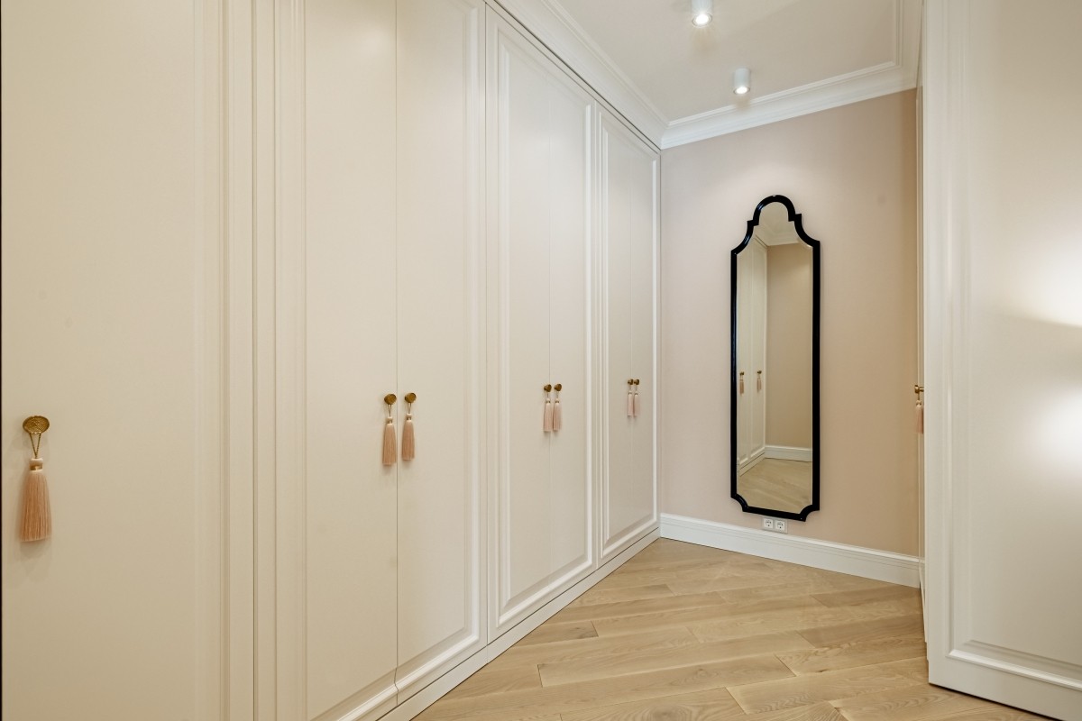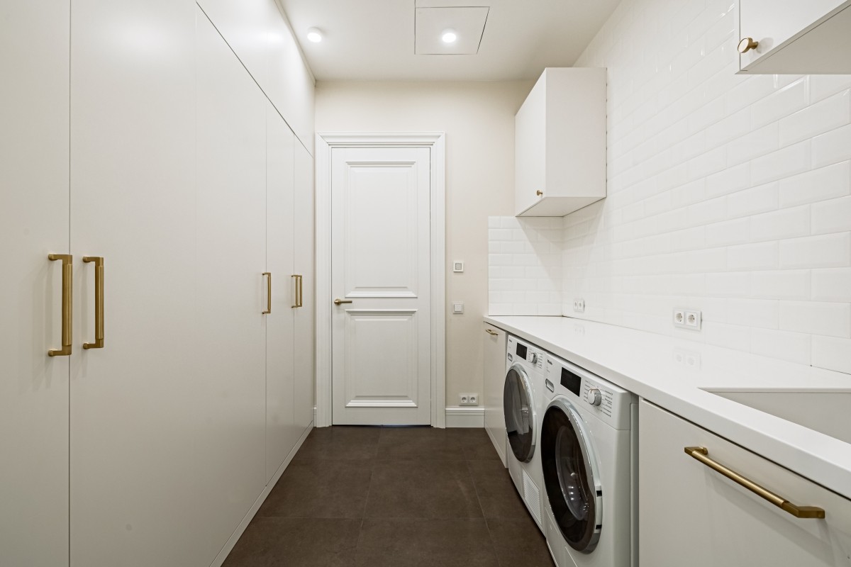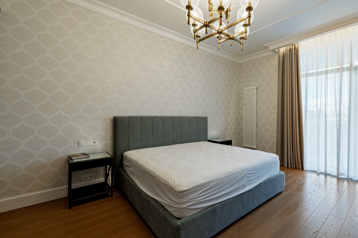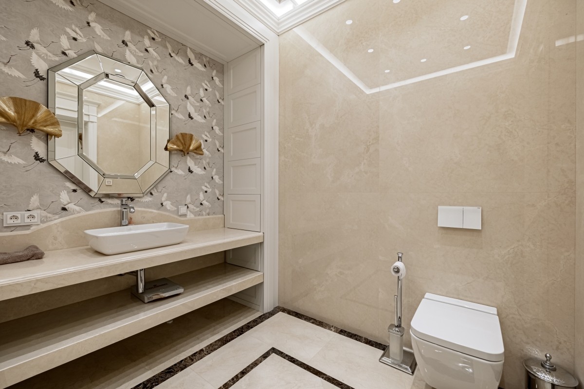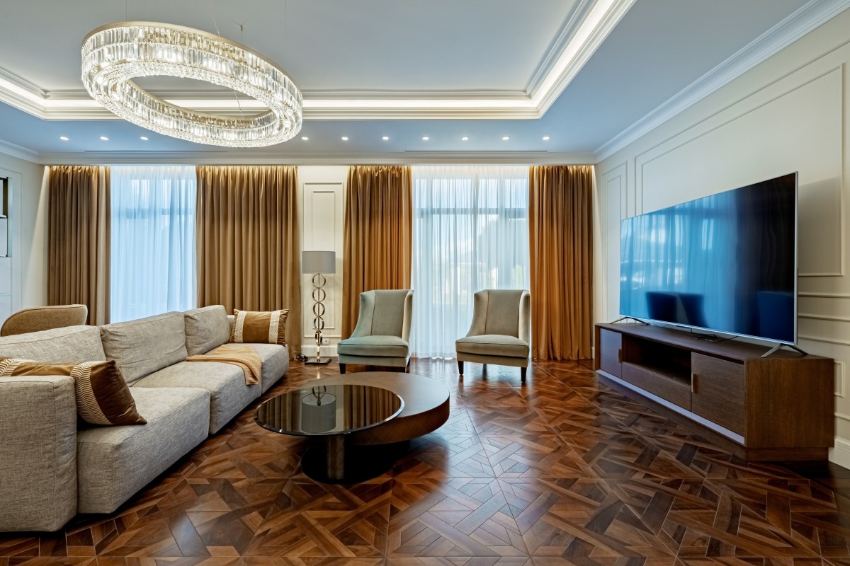 Интерьер выполнен в современном классическом стиле, в мягких постельных тонах, панорамные окна пропускают много света, делая пространство визуально шире. Со вкусом подобрана мебель и аксессуары, передовые световые решения. Гостиную украшает двухсторонний дровяной камин. Зона СПА с бассейном, джакузи, сауной и хамамом скрасят будни владельцев. Винный погреб заслуживает особого внимания.