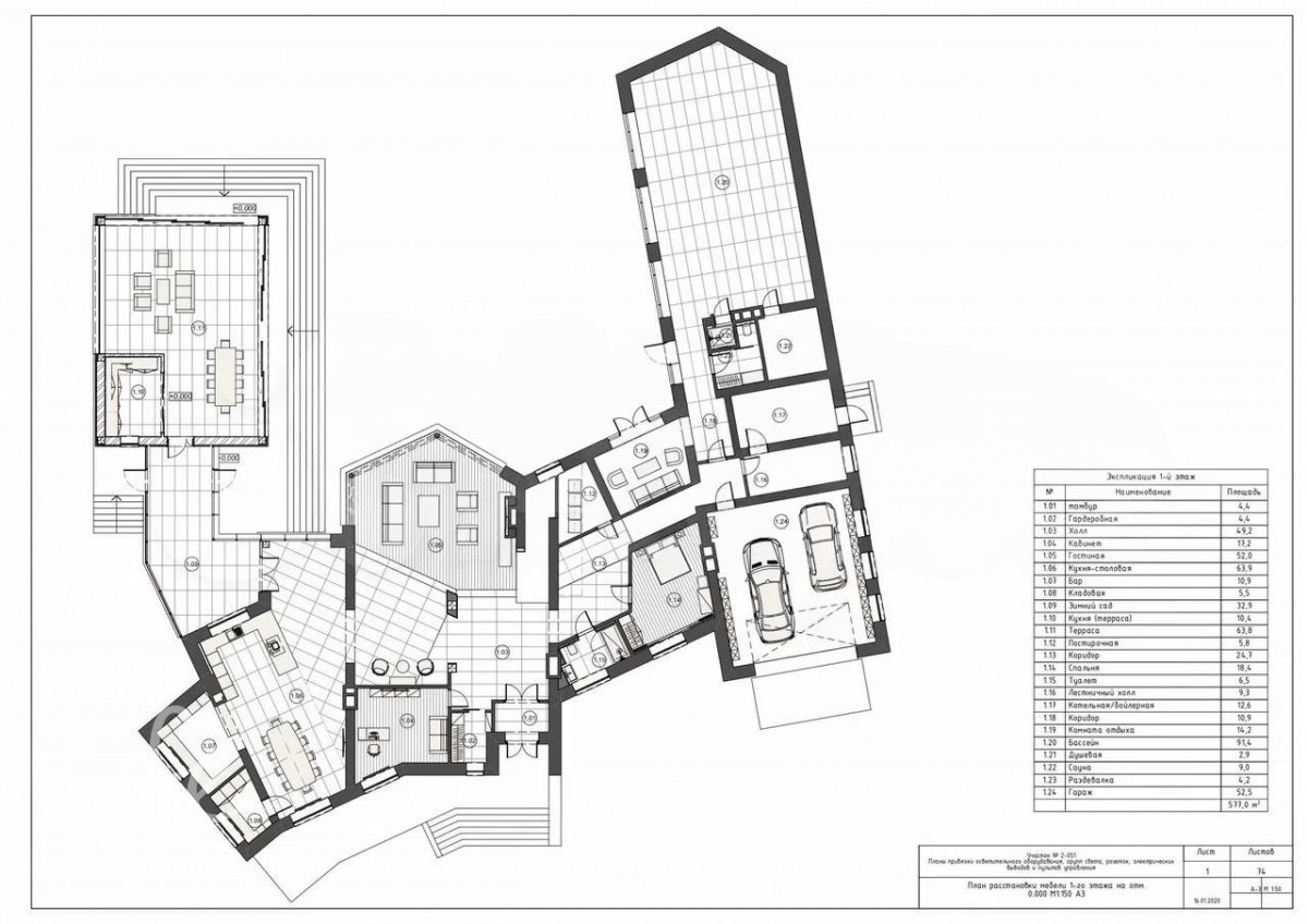 1 этаж: прихожая, гардеробная, холл, гостиная, кухня-столовая с выходом на террасу, бар, кладовая, зимний сад, кабинет, с/у, спальня, СПА-зона с бассейном и сауной, бойлерная, гараж на два автомобиля.