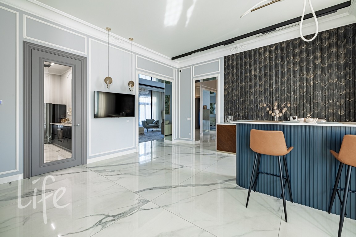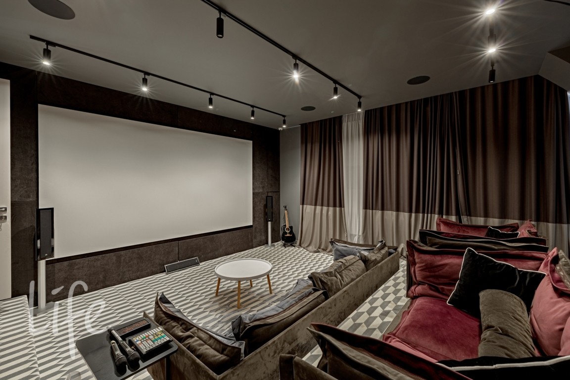 1 этаж: кухня, столовая, гостиная с биокамином и выходом на террасу, кабинет, домашний кинотеатр с профессиональным оборудованием, звуком и шумоизоляцией, спальня с с/у, с/у,