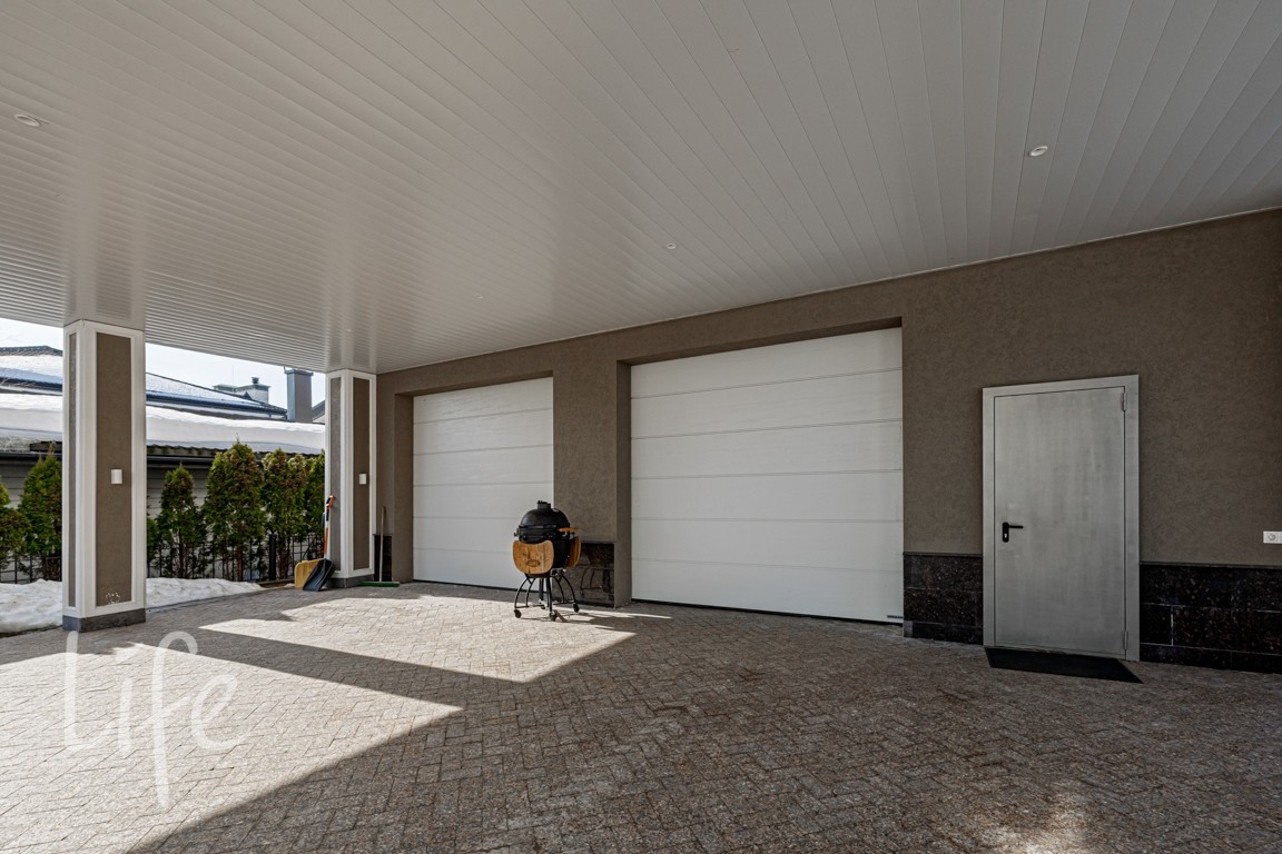 На участке гостевой дом 250 кв.м со своим котлом: на втором этаже 3 спальни, гардеробная, оборудованная современная кухня, 2 с/у для гостей и персонала, на первом — гараж сразу на 6 машин. В гараже установлены розетки для подзарядки электроавтомобилей мощностью до 32 ампер.