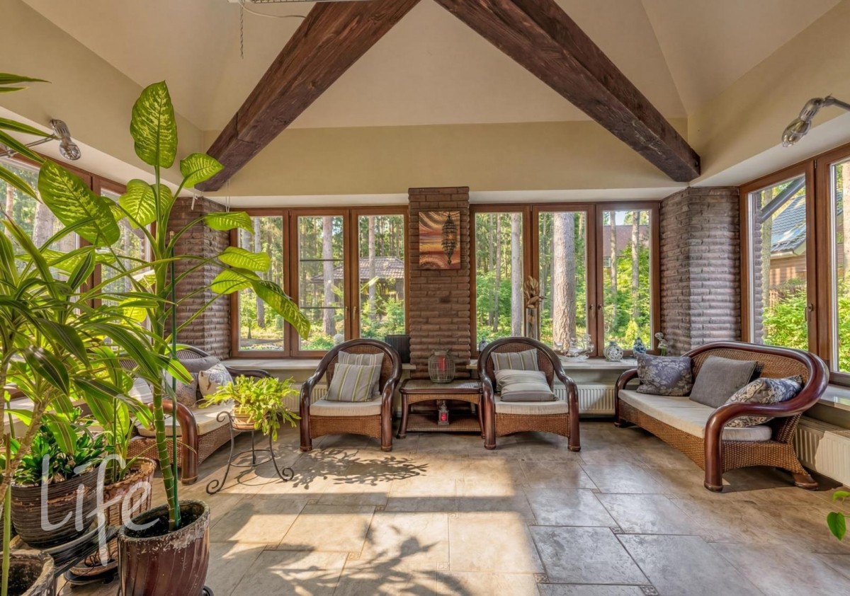 1 этаж: гардеробная, гостевой с/у, кухня, столовая, гостиная с камином и выходом на террасу, зимний сад, котельная, постирочная, гараж на 2 м/м с кладовой и мойкой.