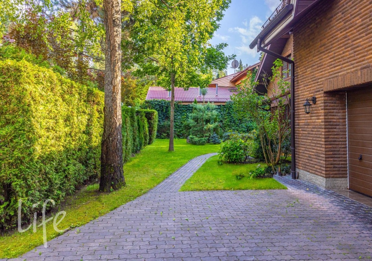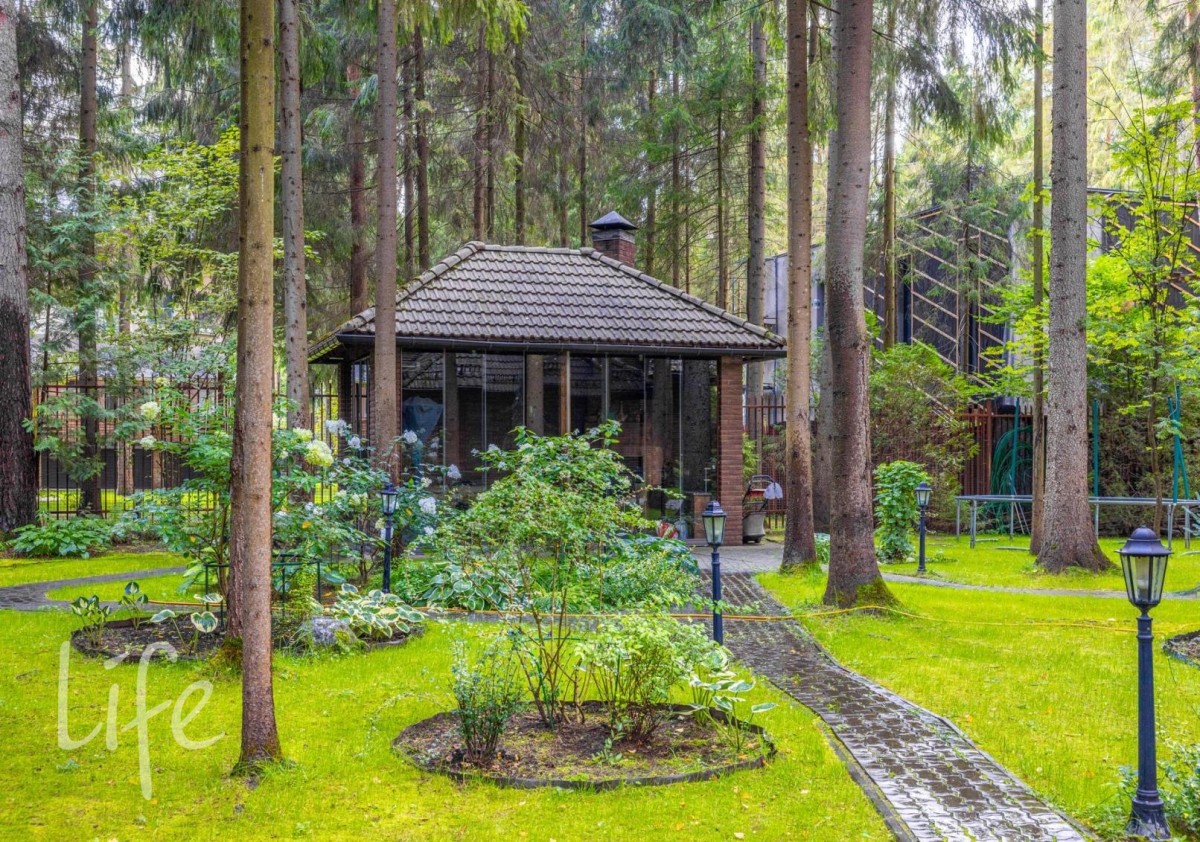 На просторном участке в 15 соток завершен ландшафтный дизайн с декоративными деревьями и кустарниками. На участке также расположена беседка-барбекю.