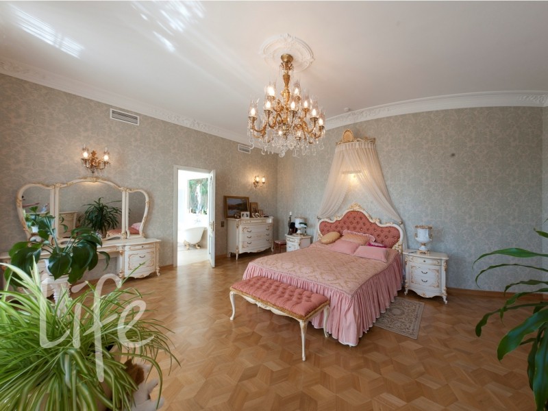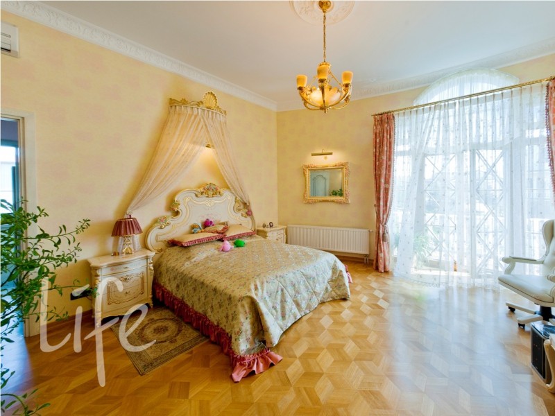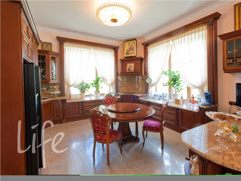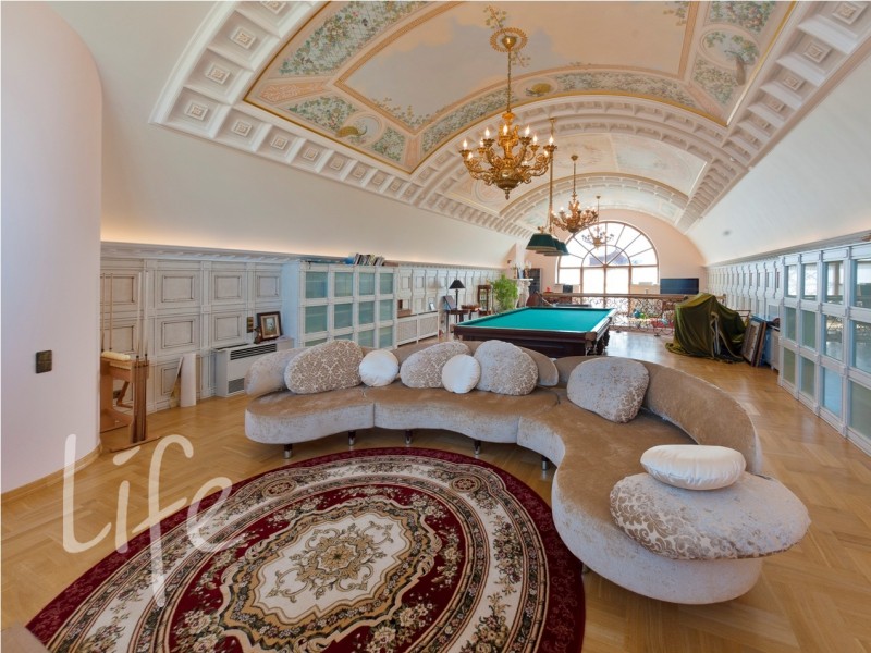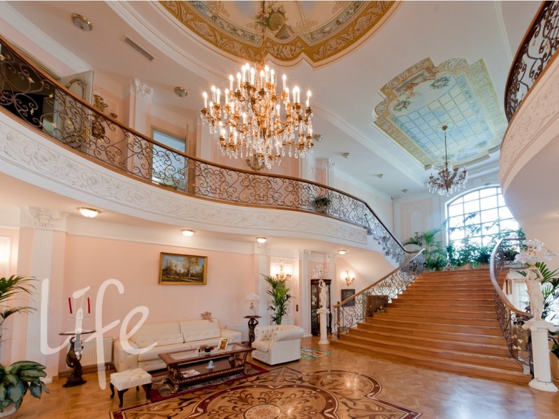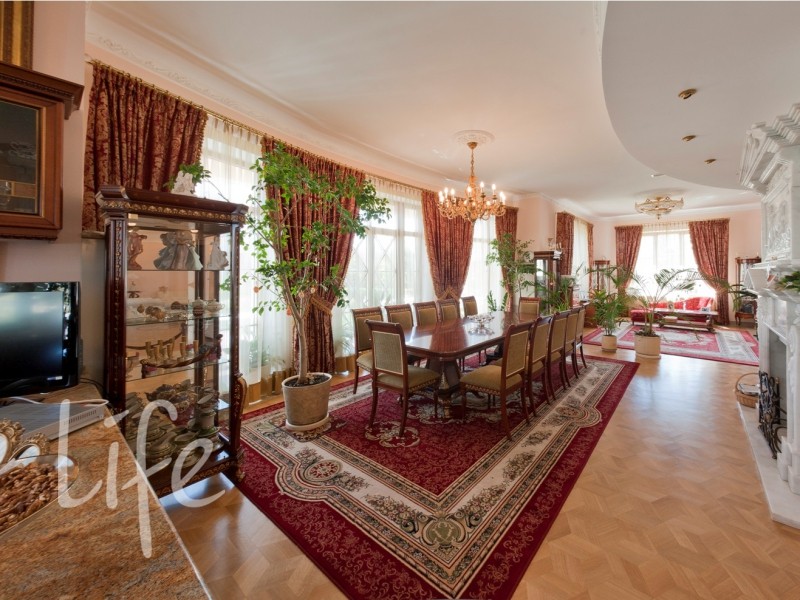 Охраняемый поселок. Дом в классическом стиле, требует косметического ремонта. Кованные лестницы, мраморные камины, штучный паркет. Эксклюзивные потолки, выполненные художниками из Эрмитажа, — художественные холсты, масло.