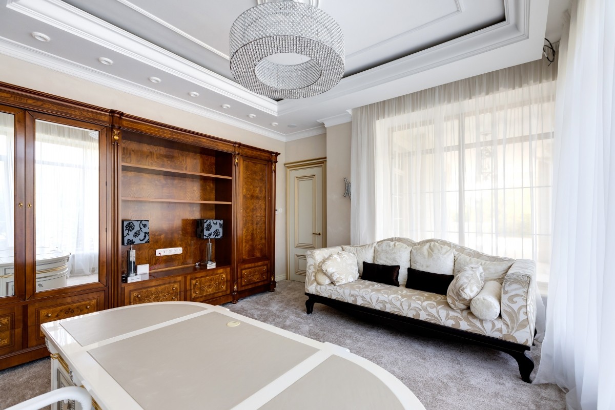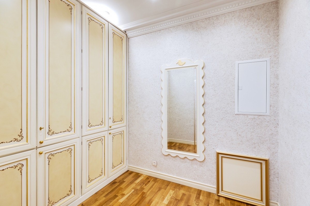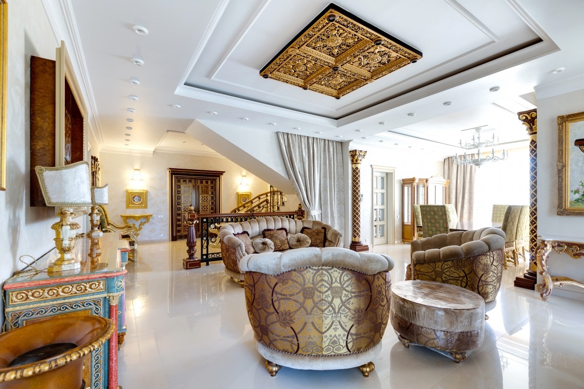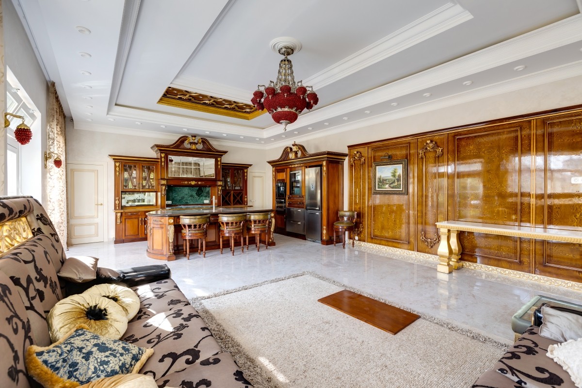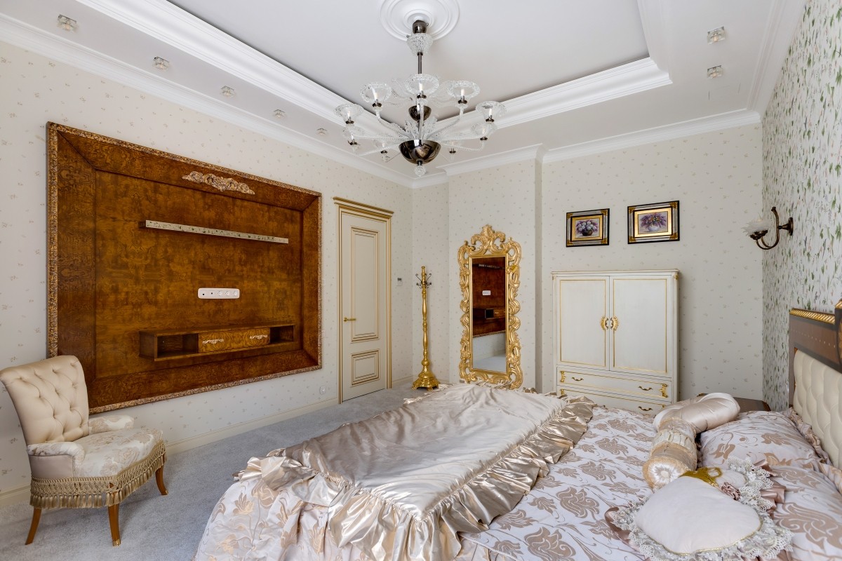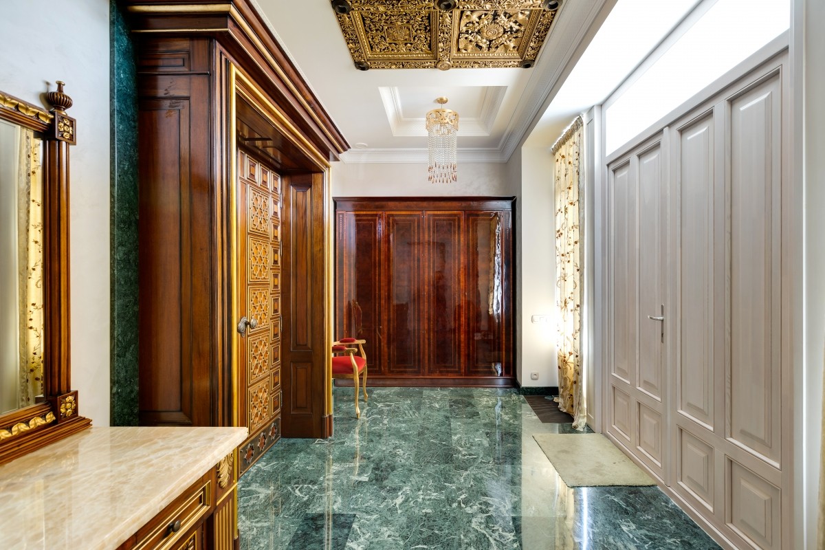 Интерьер выполнен в стиле классицизма, отделка из роскошных, дорогих материалов. Пастельные тона, золотые акценты создают атмосферу уюта и благородства. Натуральные материалы подчёркивают роскошь и долговечность. Мебель от итальянских дизайнеров подобрана со вкусом, а декор добавляет изысканности, украшая пространство.