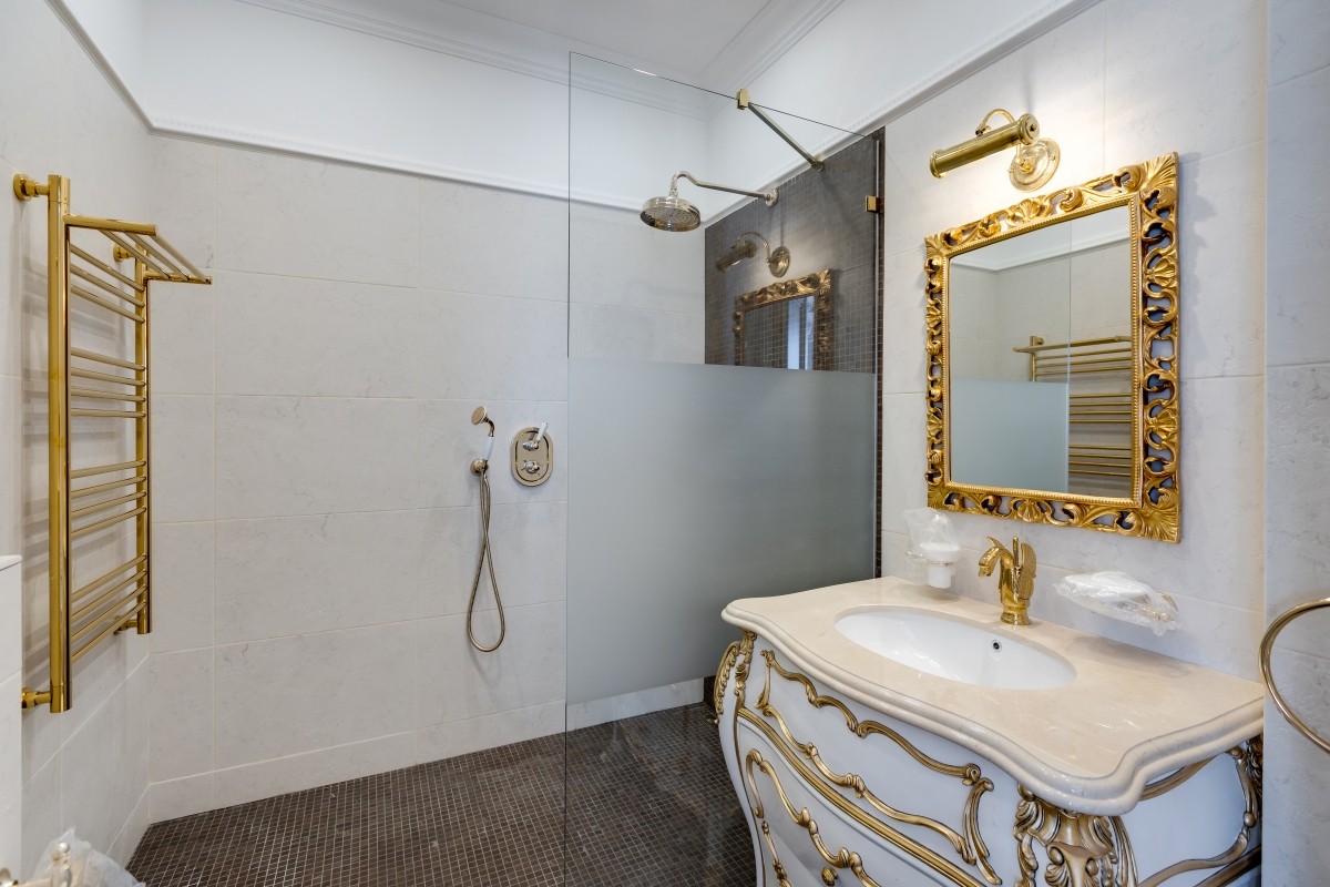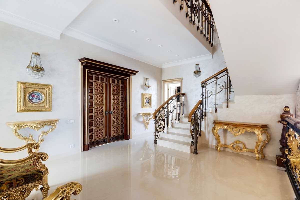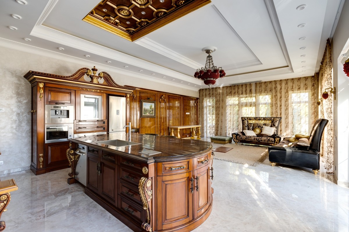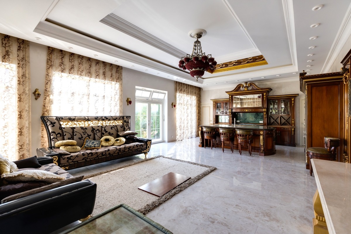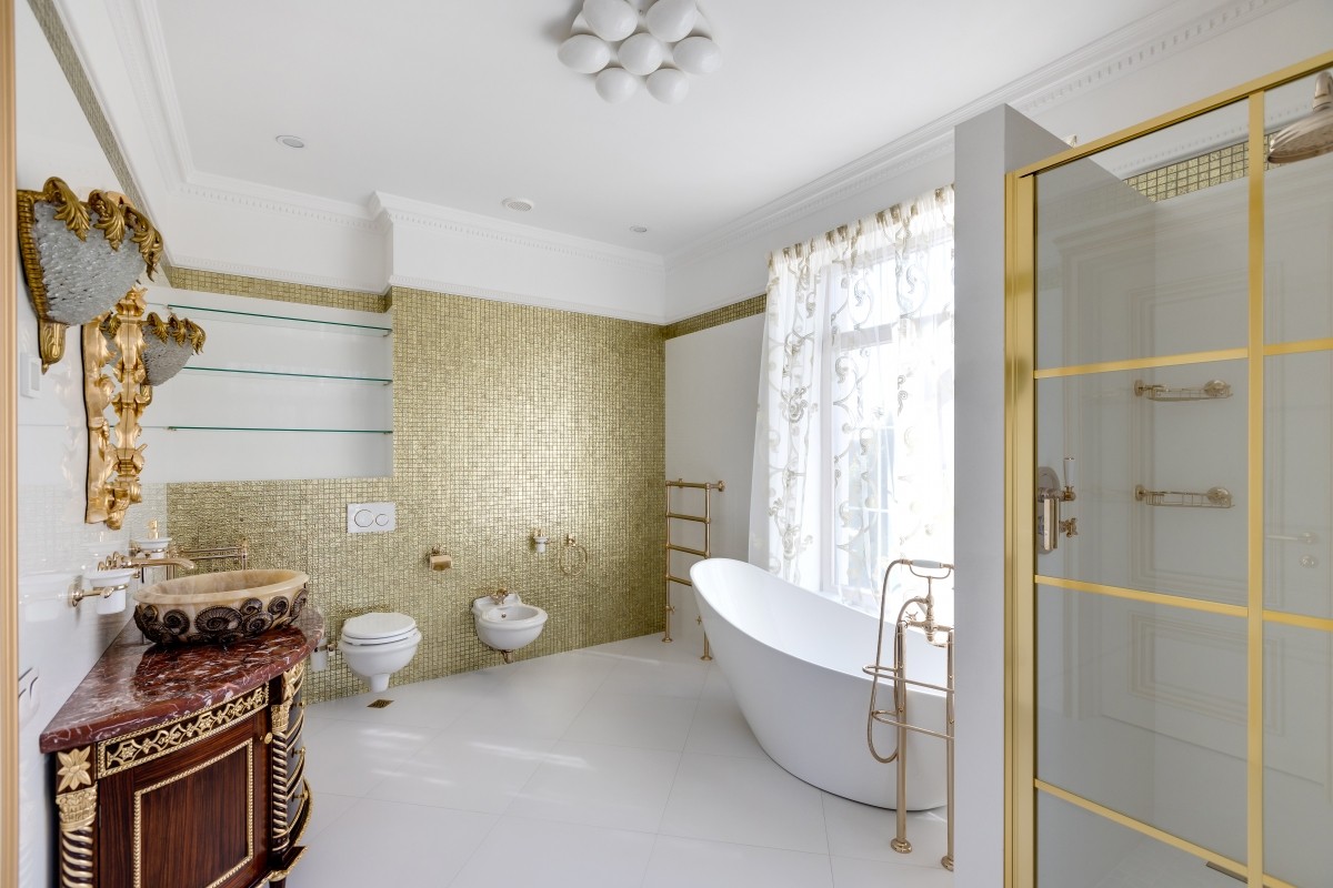 Интерьер выполнен в стиле классицизма, отделка из роскошных, дорогих материалов. Пастельные тона, золотые акценты создают атмосферу уюта и благородства. Натуральные материалы подчёркивают роскошь и долговечность. Мебель от итальянских дизайнеров подобрана со вкусом, а декор добавляет изысканности, украшая пространство.