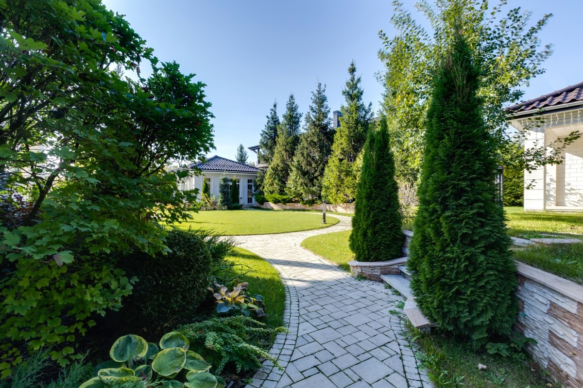 Участок правильной прямоугольной формы, с красивым ландшафтным парковым дизайном. Газон, декоративные деревья и кустарники, цветники, фонтан. Ночное освещение. На территории расположена отдельно стоящая беседка, с кухней, зона барбекю.
