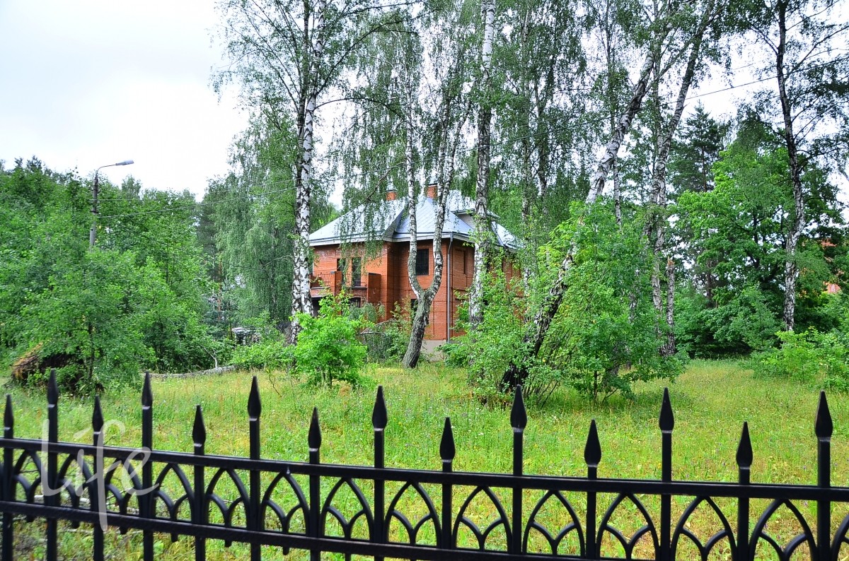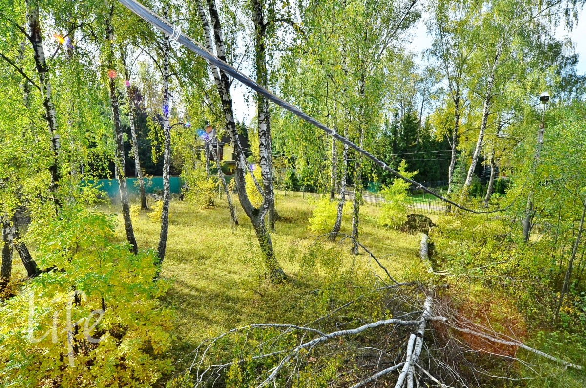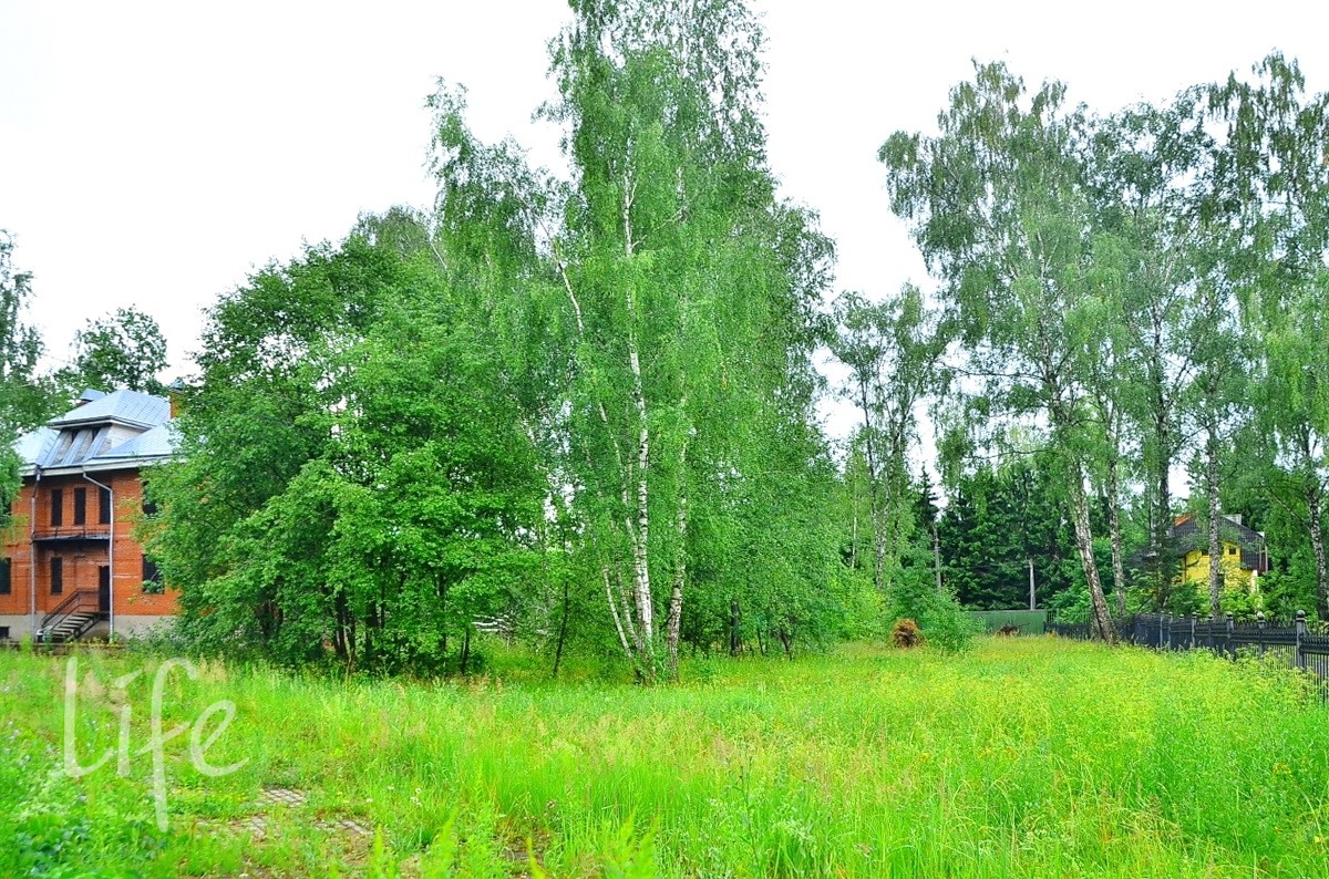 Большой участок правильной, прямоугольной формы, ровный. На территории растут березы.