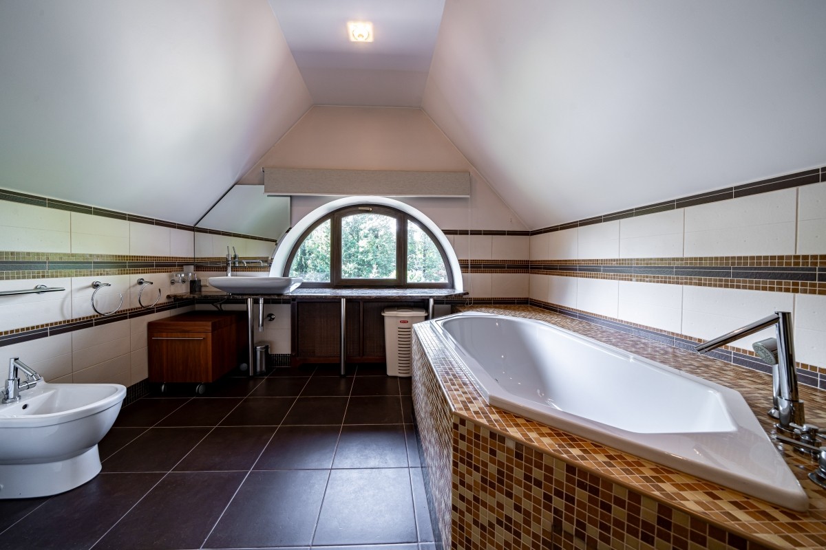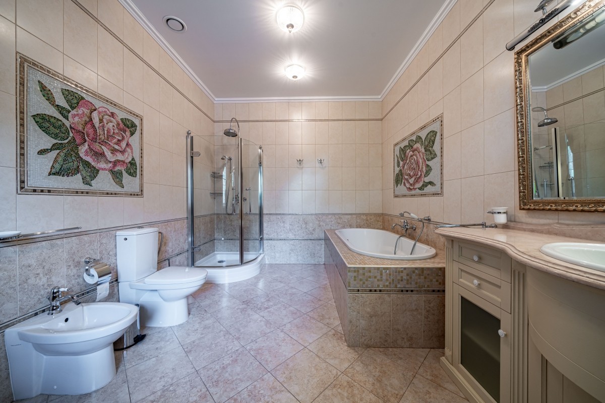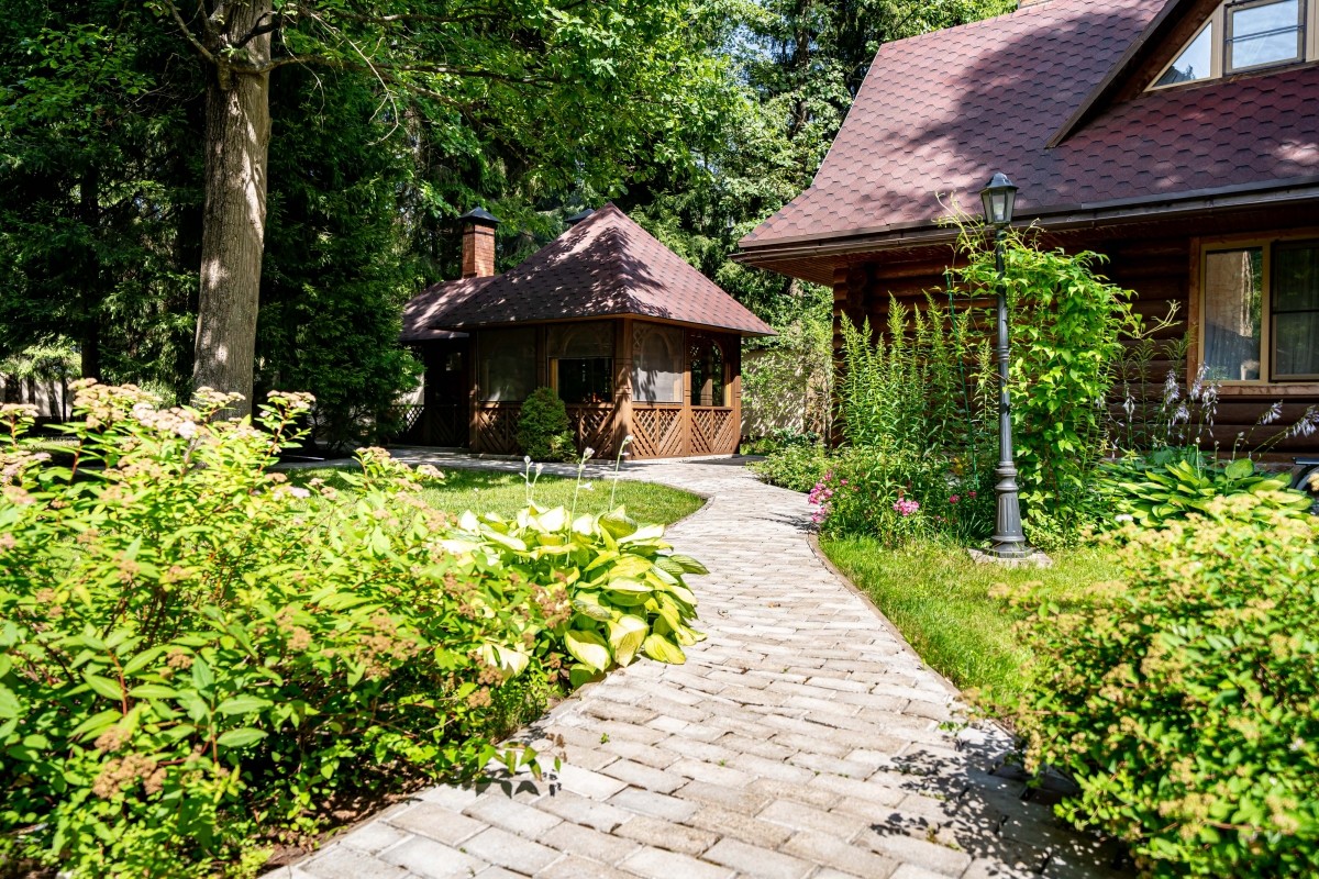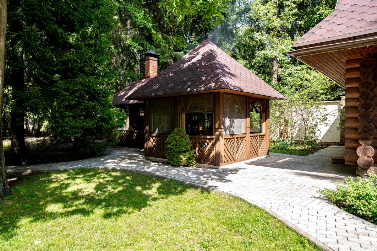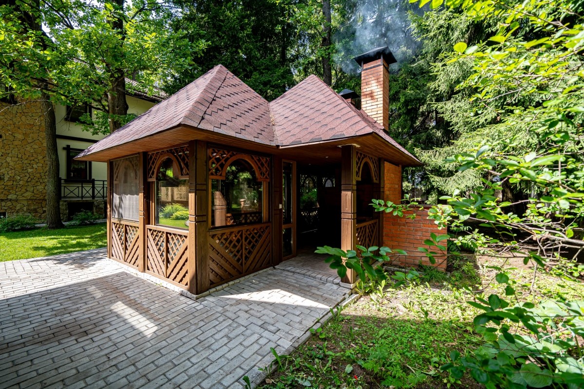 На участке: гараж на 2 м/м с квартирой для персонала на втором этаже, двухэтажная баня с бильярдом, беседка барбекю, навес на 4 м/м.