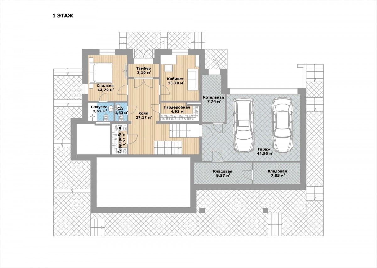 1 этаж: тамбур (3,1), парадный холл (27,2), гардеробные (4,9 + 3,7), гостевая спальня (13,7) с ванной (3,6), кабинет (13,7), гостевой с/у (1,6), гараж на 2 м/м (44,9), котельная (7,7), кладовые (7,8 + 9,6).