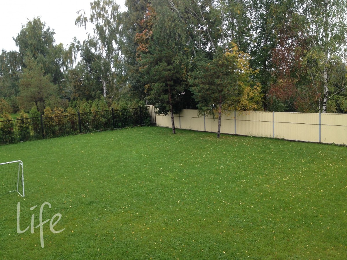 Участок правильной прямоугольной формы, газон. На территории расположен отдельно стоящий гараж с квартирой персонала.