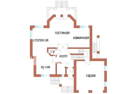 1 этаж: прихожая, гостиная с камином и выходом на террасу, кухня, столовая, с/у, гостевая спальня с с/у.
