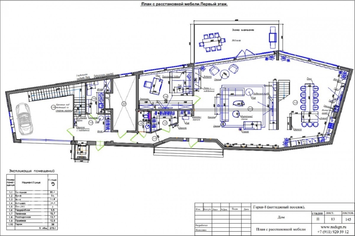 1 этаж: гостиная, кухня, холл, кабинет, с/у гардеробная, топочная, постирочная, прихожая, гараж.
