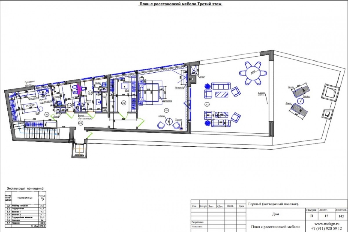 3 этаж: мастер-спальня, 2 гардеробные, 2 с/у, коридор, терраса.