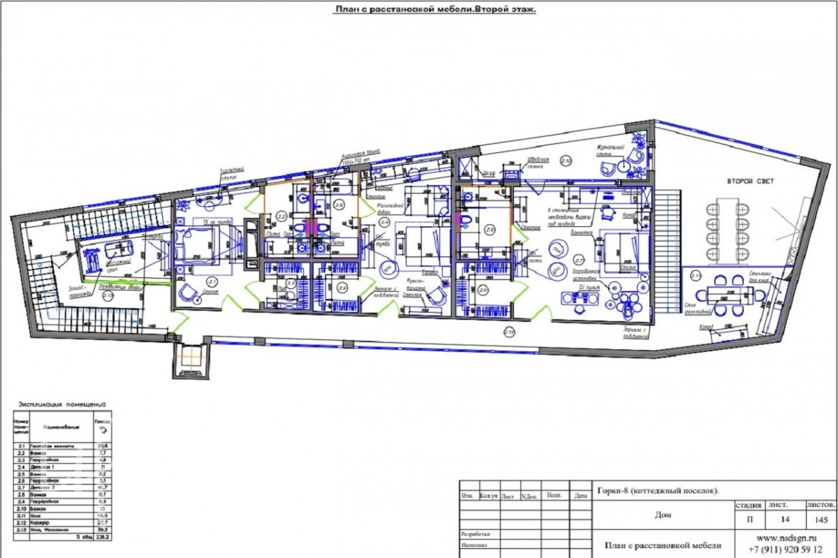 2 этаж: гостевая комната, с/у, гардеробная, 2 детские комнаты со своими с/у и гардеробными, балкон, холл, коридор, массажная, холл.