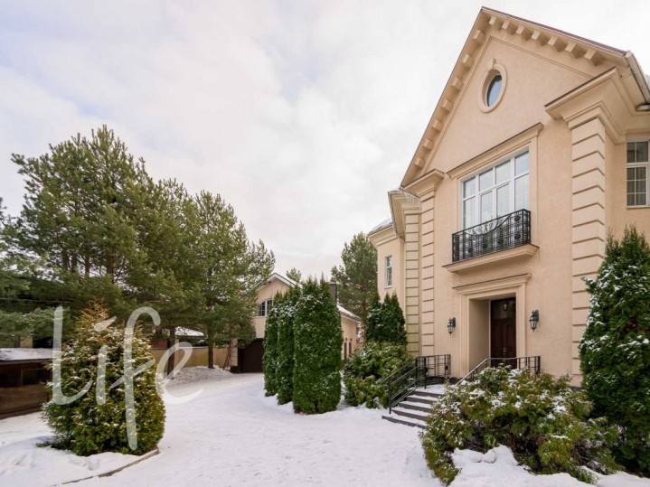 Приятный дом в классическом стиле с красивой гостиной с камином и вторым светом, 4 спальнями, бассейном 12м и домашним кинотеатром. Полностью готов к проживанию. На участке расположен гараж на 2 м/м с квартирой для персонала на втором этаже (кухня, 2 спальня, с/у).