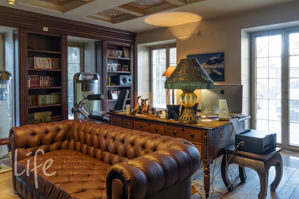 1 этаж: гостиная с итальянским мраморным камином, кухня, столовая, кабинет/библиотека с домашним кинотеатром, санузел. Окна в пол по всему периметру. Художественная роспись потолков и стен, пол-мрамор, старинная антикварная мебель, дорогие антикварные хрустальные люстры.