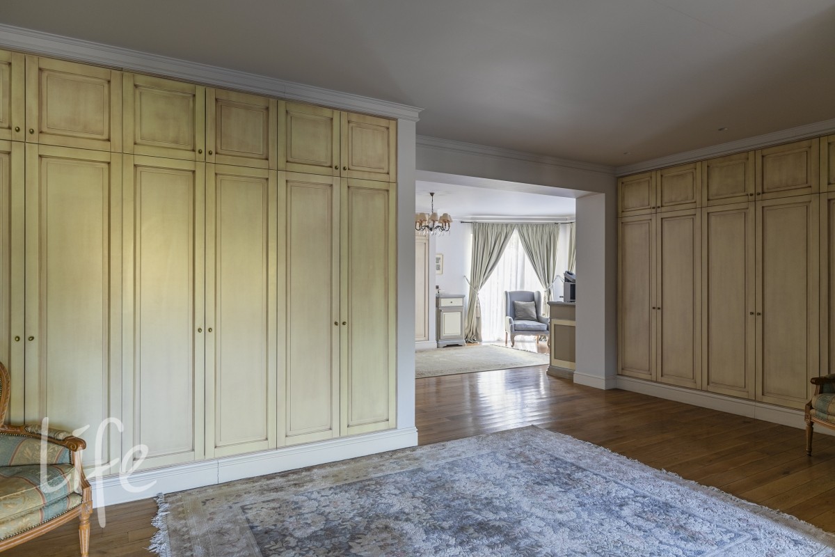 Master спальня 75 м2 с двумя с/у 16 и 17 м2, большой гардеробной и выходом на балкон 20м2 с видом на участок.
